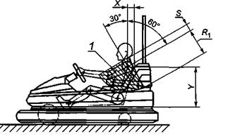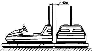 1 - зона 1; 2 - зона 2 Рисунок 15, лист 2 Системы ограничения опасных зон и входы/выходы Системы ограждения опасных зон в местах движения автомобилей должны соответствовать требованиям ОД-К1. Входы и выходы должны соответствовать требованиям ОД-Л1. Зона катания должна быть окружена барьером достаточной высоты для предотвращения выезда машин за пределы зоны. Барьер должен выдерживать удары машин на максимальной скорости. Пассажирские модули Конструкция сталкивающихся автомобилей должна не допускать выпадения пассажиров. По периметру автомобили должны быть оборудованы бамперами из мягкого материала или надувными шинами, выступающими настолько, чтобы обеспечить требования минимальных расстояний, указанных в таблице 3. Бамперы у всех машин одного аттракциона устанавливают на одинаковой высоте, равной высоте ограждения (барьера) дороги аттракциона. Все движущиеся и опасные детали и узлы автомобилей должны быть спроектированы и изготовлены так, чтобы устранить риск получения травмы, или защищены так, чтобы свести к минимуму риск получения травмы от ударов. Устройства фиксации Сталкивающиеся автомобили должны быть оснащены ремнями безопасности или иными эквивалентными по эффективности устройствами, защищающими детей от получения травм при столкновении с другими автомобилями. В случае установки ремней безопасности их ширина должна быть не менее 25 мм. Автомобили на скоростных трассах должны быть оборудованы соответствующими ремнями безопасности. Разное Покрытие зоны вождения должно быть гладким и ровным, а материал покрытия должен выдерживать расчетные нагрузки. Сталкивающиеся автомобили должны быть спроектированы и изготовлены так, чтобы риск опрокидывания был минимальным. Максимальная скорость автомобилей должна быть не более 12 км/ч. На автодромах, предназначенных для детей до восьми лет, катающихся без сопровождения взрослых, скорость автомобилей не должна превышать 4 км/ч. При наличии высокоэффективных амортизаторов скорость можно увеличить до 14 км/ч, если силы воздействия на пассажиров при соударении не превышают силы на обычных сталкивающихся автомобилях, двигающихся со скоростью до 12 км/ч. Максимальные скорости всех автомобилей, двигающихся по одной трассе, не должны отличаться более чем на 15%, а масса - на 30%. На аттракционе должен быть установлен выключатель, позволяющий оператору со своего рабочего места останавливать все электромобили одновременно. Требования к электромеханическому оборудованию Токопроводящие детали сталкивающихся автомобилей, доступные для касания пассажирами, могут находиться под напряжением не более 25 В переменного тока или 60 В постоянного тока (максимальный уровень пульсаций - не более 10%), подаваемым от разделительного трансформатора, по ГОСТ 30030 или от эквивалентного генератора. В случае если расположение разнополярных токоведущих частей исключает прикосновение человека к двум токоведущим частям одновременно, токоведущие части могут находиться под максимальным напряжением не более 50 В переменного тока или 120 В постоянного тока с максимальным уровнем пульсаций не более 10%, подаваемым от разделительного трансформатора по ГОСТ 30030 или от эквивалентного генератора постоянного или переменного тока. Открытые, незащищенные токопроводящие устройства должны быть расположены н