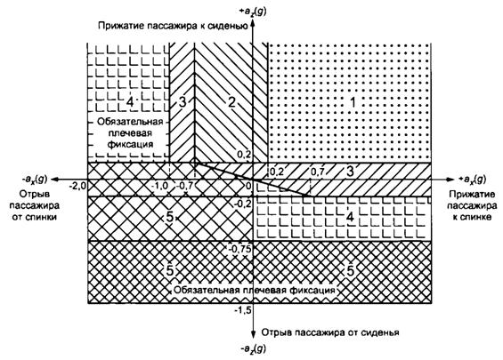 Рисунок 11 -Диаграмма ускорений, действующих на пассажиров, для назначения устройств фиксации Для зоны 1 устройство фиксации не требуется, если исходить из значений действующих ускорений (по другим критериям фиксация может быть необходима). Для зоны 2 необходим, по меньшей мере, следующий тип устройства фиксации: УФ-А1 - коллективное устройство для двух или более пассажиров; УФ-Б1 - с нерегулируемым фиксирующим положением (например, дуги, штанги и т.п.); УФ-В2 - запираемое вручную пассажиром; УФ-Г1 - отпираемое вручную пассажиром; УФ-Д1 - без сигнализации; УФ-Е1 - с ручным приводом; УФ-Ж1 - не обязательно резервирование. УФ-И1/И2 - требуется одно устройство фиксации или можно обойтись без него, если пассажиры, при условии, что они не могут быть выброшены из пассажирского модуля под действием возникающих при движении сил, могут адекватно реагировать на действующие на них силы, опираясь на поручни, подножки и подобные приспособления. Для зоны 3 необходимо, по крайней мере, одно устройство фиксации со следующими признаками: УФ-А1 - коллективное, для двух или более пассажиров; УФ-Б2 - с индивидуально регулируемым фиксирующим положением; УФ-В3 - запираемое вручную оператором; УФ-Г1 - отпираемое вручную пассажиром; УФ-Д1 -без сигнализации; УФ-Е1 - с ручным приводом; УФ-Ж2 - с безотказно функционирующим замком; УФ-И2 - с одним устройством фиксации на каждого пассажира. Для зоны 4 необходимо, по крайней мере, одно устройство фиксации со следующими признаками: УФ-А2 - индивидуальное для каждого пассажира; УФ-Б2 - с индивидуально регулируемым фиксирующим положением; УФ-В4 - запирающееся автоматически при достижении фиксирующего положения; УФ-Г2 - отпираемое вручную оператором; УФ-Д1 - без сигнализации; УФ-Е1 - с ручным приводом; УФ-Ж2 - с безотказно функционирующим замком; УФ-И2 - с каким-либо одним устройством фиксации для каждого пассажира. Для зоны 5 необходимо, по крайней мере, одно устройство фиксации со следующими признаками: УФ-А2 - индивидуальное для каждого пассажира; УФ-Б3 - с автоматическим контролем запирания; УФ-В5 - автоматически запирающееся и контролируемое при достижении фиксирующего положения; УФ-Г3 - отпираемое оператором централизованно; УФ-Д3 - со световой и/или акустической сигнализацией и блокировкой пуска; УФ-Е1 - с ручным приводом; УФ-Ж3 - с безотказными (конструктивно и функционально) устройством фиксации и замком; УФ-И3/И4 - с двумя устройствами фиксации, одно из которых является дублирующим. В пограничных случаях можно выбирать более низкую категорию. Диаграмма ускорений, приведенная на рисунке 11, служит общим руководством и не содержит информации о допустимых пределах ускорений, приведенных в приложении А. При конструировании устройств фиксации должны быть учтены конкретные условия, например, длительность действия ускорения. В частности, если боковые ускорения превышают ±0,5 g, то сиденья, спинки и устройства фиксации должны быть оборудованы боковыми упорами. Необходимо также проанализировать возможность остановки пассажирских модулей в неожиданных положениях (например, вверх ногами). Наличие других рисков (см. также 5.8.2) может потребовать использования устройств фиксации других типов. Если устройство фиксации выбрано по диаграмме (см. рисунок 11), а дополнительно к нему требуется установить дублирующее устройство, то это второе устройство должн