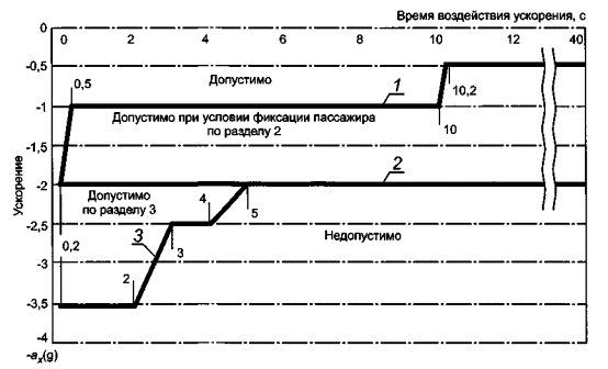 Кривая 2 - относится к позе пассажира «сидя» при использовании системы фиксации плеч в дополнение к системе фиксации таза и опорам для рук. Скорость нарастания ускорения - не более 15 g/с.