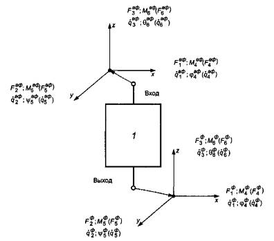 4 Метод измерений4.1 Определение излучаемой колебательной мощности косвенным методом. Общие сведения4.1.1 На рисунке 1 приведены аналитическая модель машины, установленной на виброизоляторы, и система координат, связанная с машиной. На рисунке 2 приведены система координат на входе и выходе виброизолятора, а также обозначения составляющих силы и скорости вибрации.