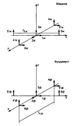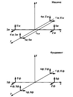 Рисунок 4 - Схема расположения датчиков вибрации при установке машины на протяженный виброизолятор 10.3.3 Если оператор владеет информацией только об ограниченном числе механических сопротивлений виброизолятора из общей матрицы, то при измерении излучаемой колебательной мощности по формулам (8), (9) и (12), (13) число членов в формулах и измеряемых составляющих колебательной мощности ограничивают числом известных коэффициентов матрицы механических сопротивлений виброизолятора. 10.3.4 В случае если виброизолятор имеет одно болтовое соединение с машиной и одно болтовое соединение с фундаментом, измерение линейных составляющих скорости (или ускорения) вибрации машины и фундамента выполняют при расположении датчиков вибрации на головке болта по схеме, приведенной на рисунке 3 (см. 1м, 2м, 3м, 1ф, 2ф, 3ф на рисунке 3). Поворотные составляющие скорости вибрации измеряют с помощью датчиков 4м, 4'м, 5м, 5'м, 6м, 6'м, 4ф, 4'ф, 5ф, 5'ф, 6ф, 6'ф, схема расположения которых приведена на рисунке 3. Поворотные составляющие ускорения вибрации определяют по формулам: