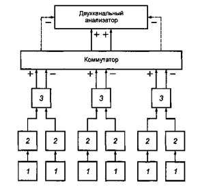 1 - датчик ускорения; 2 - предварительный усилитель (усилитель заряда); 3 - сумматор Рисунок 5 - Схема типичного измерительного тракта для определения взаимного спектра составляющих вибрации машины и фундамента с помощью датчиков ускорения вибрации 10.5.2 Полосу спектрального анализа выбирают в соответствии с 4.1.8. 10.5.3 Перед выполнением измерений излучаемой колебательной мощности проводят контроль идентичности фазовых характеристик каналов тракта измерения скорости вибрации до и после виброизолятора. Полученные данные вводят в программу компьютера для учета неидентичности фазовых характеристик каналов скорости при обработке результатов измерений. 10.5.4 При измерении вибрации и взаимных спектров вибрации машины и фундамента в районе n-го виброизолятора электрические сигналы с двух датчиков вибрации, образующих пару, складывают для нахождения линейных составляющих вибрации и вычитают для нахождения поворотных составляющих вибрации машины и фундамента. Перед сложением и вычитанием сигналов необходимо скорректировать возможную разницу между чувствительностями и фазовыми характеристиками датчиков вибрации, аналоговых устройств и анализаторов БПФ. Вычитание следует заменить сложением и, наоборот, сложение - вычитанием в том случае, если один из датчиков вибрации, составляющих пару, установлен встречно. 10.6 Определение числа выборок анализатора nd, участвующих в усреднении измерений взаимного спектра вибрации10.6.1 Для определения числа выборок анализатора