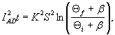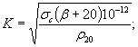 S - площадь поперечного сечения токопроводящего элемента, мм2, для жил, соответствующих МЭК 60228, используют номинальное сечение; Θf - конечная температура, °С; Θi - начальная температура, °С; β - величина, обратная температурному коэффициенту сопротивления токопроводящего элемента при 0 °С, К, приведена в таблице 1; ln - loge; σс - удельная объемная теплоемкость токопроводящего элемента при 20 °С, Дж/К·м3, приведена в таблице 1; ρ20 - удельное электрическое сопротивление токопроводящего элемента при 20°С, Ом·м, приведено в таблице 1.