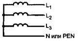Рисунок 5 - Трехфазная четырехпроводная система Трехфахзная четырехпроводная система с нейтральным проводником или PEN-проводником. По определению PEN-проводник не является токоведущим проводником, но является проводником, проводящим рабочий ток. Примечание 1 - В случае однофазной двухпроводной цепи, которая является ответвлением от трехфазной четырехпроводной цепи, два проводника представляют собой или два линейных проводника, или линейный проводник и нейтральный проводник, или линейный проводник и PEN-проводник. Примечание 2 - В электроустановках, в которых нагрузки включены между фазами, может отсутствовать необходимость в нейтральном проводнике. Примечание 3 - В однофазной двухпроводной цепи (см. рисунок 1) может быть еще один вариант устройства проводников - линейный проводник и PEL-проводник. Примечание 4 - В однофазной трехпроводной цепи (см. рисунок 2) может быть еще один вариант устройства проводников - два линейных проводника и PEN-проводник (см. рисунок 31В3). Примечание 5 - В двухфазной трехпроводной цепи (см. рисунок 3) может быть еще один вариант устройства проводников - два линейных проводника и PEN-проводник. Примечание 6 - В трехфазной трехпроводной цепи (см. рисунок 4) может быть еще один вариант устройства проводников - два линейных проводника и PEL-проводник. 312.1.2 Токоведущие проводники в цепях постоянного тока