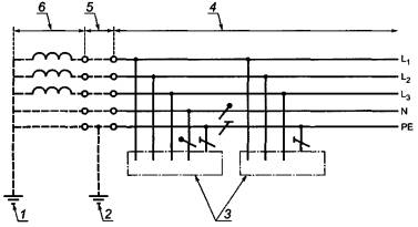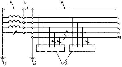 1 - заземление источника питания; 2 - заземление распределительной сети; 3 - открытые проводящие части; 4 - электроустановка; 5 - распределительная сеть (при ее наличии); 6 - источник питания Примечания 1 В электроустановке допускается дополнительное заземление защитного проводника (РЕ). 2 Заземление системы может быть выполнено в источнике питания и дополнительно - в распределительной сети. Рисунок 31А1 - Система TN-S трехфазная четырехпроводная с разделенными нейтральным проводником и защитным проводником по всей системе