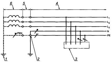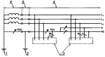 1 - заземление источника питания; 2 - заземление распределительной сети; 3 - открытые проводящие части; 4 - электроустановка; 5 - распределительная сеть (при ее наличии); 6 - источник питания Примечания 1 В электроустановке допускается дополнительное заземление PEN-проводника или защитного проводника (РЕ). 2 Заземление системы может быть выполнено в источнике питания и дополнительно - в распределительной сети. 3 Функции нейтрального и защитного проводников объединены в одном проводнике в части системы. Рисунок 31В1 - Система TN-C-S трехфазная четырехпроводная, в которой PEN-проводник разделен на защитный проводник РЕ и нейтральный проводник N где-то в электроустановке