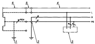 1 - заземление источника питания; 2 - заземление распределительной сети; 3 - открытая проводящая часть; 4 - электроустановка; 5 - распределительная сеть (при ее наличии); 6 - источник питания Примечания 1 В электроустановке допускается дополнительное заземление защитного проводника (РЕ). 2 Заземление системы может быть выполнено в источнике питания и дополнительно - в распределительной сети. Рисунок 31А3 - Система TN-S трехфазная трехпроводная с заземленным защитным проводником и без нейтрального проводника по всей системе - система TN-C-S, в которой нейтральная и защитная функции объединены в одном проводнике в части системы (см. рисунки 31В1, 31В2 и 31В3). В электроустановках жилых и общественных зданий, торговых предприятий, медицинских учреждений запрещено применять PEN-проводники. PEN-проводник распределительной сети должен быть разделен на нейтральный и защитный проводники на вводе электроустановки (см. рисунки 31В2 и 31В3);