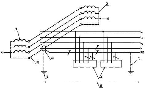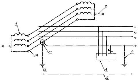 1 - источник питания 1; 2 - источник питания 2; 3 - заземление источника питания; 4 - открытые проводящие части; 5 - электроустановка a) Не допускается прямое присоединение к земле нейтральной точки трансформатора или генератора, соединенных по схеме звезда. b) Проводник для взаимного соединения нейтральных точек трансформаторов или генераторов, соединенных по схеме звезда, должен быть изолирован. Функция этого проводника аналогична функции PEN-проводника, однако он не должен быть подсоединен к электроприемникам. c) Должно быть предусмотрено только одно соединение между взаимно соединенными нейтральными точками источников питания и защитным проводником (РЕ). Это соединение должно быть расположено внутри главного распределительного устройства. d) В электроустановке допускается дополнительное заземление защитного проводника (РЕ). Рисунок 31D - Система TN-C-S с несколькими источниками питания трехфазная четырехпроводная с разделенными защитным проводником и нейтральным проводником для электроприемников В промышленных электроустановках только с двухфазными и трехфазными нагрузками между линейными проводниками нет необходимости предусматривать нейтральный проводник (см. рисунок 31Е). В этом случае защитный проводник должен иметь несколько соединений с землей.