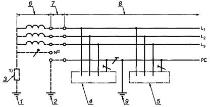 1 - заземление источника питания; 2 - защитное заземление системы; 3 - полное сопротивление; 4,5 - открытые проводящие части; 6 - источник питания; 7 - распределительная сеть (при ее наличии); 8 - электроустановка; 9 - защитное заземление в электроустановке 1) Система может быть присоединена к земле через большое полное сопротивление. Это присоединение может быть осуществлено, например, в нейтральной точке, искусственной нейтральной точке или на линейном проводнике. 2) Нейтральный проводник может быть или может отсутствовать в системе. Примечания 1 В электроустановке допускается дополнительное заземление защитного проводника (РЕ). 2 Защитное заземление в электроустановке может быть предусмотрено или как альтернатива защитному заземлению системы, или в качестве дополнительной меры предосторожности. Нет необходимости, чтобы это заземление находилось на вводе в электроустановку. Рисунок 31G1 - Система IT трехфазная трехпроводная со всеми открытыми проводящими частями, соединенными защитным проводником, которые заземлены совместно