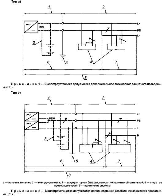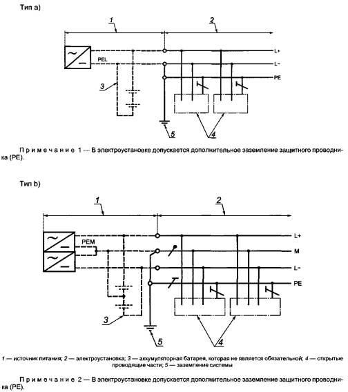 Рисунок 31М - Системы IT постоянного тока - двухпроводная а), трехпроводная b) 313 Источники питания313.1 Общие положения313.1.1 Приведенные ниже характеристики любого применяемого источника питания и обычный диапазон этих характеристик, где это необходимо, следует определять путем расчета, измерения, сбора материала или проверки: - номинальное(ые) напряжение(ия); - род тока и его частота; - ожидаемый ток короткого замыкания на вводе электроустановки; - полное сопротивление петли замыкания на землю той части системы, которая расположена снаружи электроустановки; - возможность выполнения требований, предъявляемых электроустановкой, в том числе обеспечение максимальной нагрузки; - тип и номинальные характеристики устройства защиты от сверхтока, установленного на вводе электроустановки. Эти характеристики следует оценивать как для внешнего, так и для внутреннего источников питания. Требования распространяются на основные источники питания, на источники питания систем безопасности и резервные источники питания. 313.2 Источники питания для систем безопасности и резервных системЕсли наличие систем безопасности, имеющих отношение к противопожарным мероприятиям и другим обстоятельствам аварийной эвакуации из зданий, требуется, например, органами управления и (или) если обеспечение резервного питания требуется лицом, устанавливающим технические требования к электроустановке, характеристики источников питания для систем безопасности и (или) резервных систем следует определять для каждого в отдельности. Такие источники питания должны иметь соответствующую мощность, надежность, номинальные характеристики и соответствующее время переключения для указанного вида работы. Дополнительные требования к источникам питания для систем безопасности приведены в ГОСТ Р 50571.29, раздел 556 и разделе 35 настоящего стандарта. Для резервных систем настоящий стандарт никаких специальных требований не предусматривает. 314 Разделение электроустановки на цепи314.1 Каждая электроустановка должна быть разделена на несколько цепей, чтобы в случае необходимости: - предупредить возможность повреждения и свести к минимуму последствия повреждения; - облегчить безопасный осмотр, испытание и обслуживание; - предотвратить опасность, которая может возникнуть вследствие повреждения единственной цепи, например осветительной цепи; - уменьшить возможность нежелательного срабатывания устройств дифференциального тока (УДТ) из-за чрезмерных токов в защитном проводнике (РЕ), возникших не вследствие повреждения; - уменьшить воздействие электромагнитных помех; - исключить подачу напряжения в цепь, которая должна быть разъединенной. 314.2 Для частей электроустановок, которые нуждаются в раздельном управлении, должны быть предусмотрены разделенные распределительные цепи для того, чтобы повреждения в одних цепях не влияли на другие цепи. 32 Классификация внешних воздействийКлассификация внешних условий - по ГОСТ Р 50571.24. 33 Совместимость33.1 Совместимость характеристикСледует оценивать любые характеристики оборудования, которые могут оказать вредное воздействие на другое электрическое оборудование или другие системы или могут привести к повреждению источника питания. К этим характеристикам относят, например: - кратковременные перенапряжения; - понижение напряжения