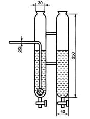 - колбы мерные 2-25-2; 2-250-2; 2-1000-2 по ГОСТ 1770; - пипетки не ниже 2-го класса точности по ГОСТ 29227; - бюретки 1-1-2-25-0,1 по ГОСТ 29251; - мензурки 50, 100 по ГОСТ 1770; - колбы Кн-2-250-34 ТХС по ГОСТ 25336; - стаканы В-1-100 ТХС по ГОСТ 25336; - печь муфельную с температурой нагрева до 1050°С; - установку для определения серы согласно рисунку 1; 1 - баллон с кислородом, снабженный редукционным вентилем для регулирования скорости поступления кислорода в печь; 2 - промывная склянка, содержащая раствор марганцовокислого калия в растворе гидроксида калия или гидроксида натрия; 3 - склянка, содержащая в нижней части плавленый хлористый кальций и слой стеклянной или обыкновенной ваты, а в верхней части - гидроксид калия или гидроксид натрия; 4 - кран, дающий возможность регулировать подачу очищенного кислорода в трубки для сжигания; 5 - трубчатая печь с силитовыми нагревателями, обеспечивающими нагрев до 1250°С; 6 - термопара; 7 - милливольтметр или потенциометр любого типа; 8 - трубки для сжигания кислорода; 9 - лодочка для сжигания пробы; 10 - очистительный сосуд с кварцевой ватой; 11 - кран перед поглотительным сосудом; 12 - поглотительный сосуд, состоящий из двух одинаковых сосудов, соединенных стеклянными перемычками. Допускается использование двух стеклянных цилиндров высотой по 250 мм из стекла одного цвета (рисунок 2); 13 - бюретка для титрования Рисунок 1 - Установка для определения серы - печь трубчатую с силитовыми нагревателями, обеспечивающими нагрев до 1250°С; - милливольтметр или потенциометр любого типа; - трубку фарфоровую одноканальную (внешний диаметр - 26 мм, внутренний диаметр - 21 мм, длина - от 850 до 900 мм); - лодочки фарфоровые ЛС2 по ГОСТ 9147; - эксикатор 2-190 по ГОСТ 25336, заполненный оксидом кальция, предварительно прокаленным при температуре от 970°С до 1050°С, или хлористым кальцием. При выполнении анализа применяют следующие материалы, растворы: - калий двухромовокислый по ГОСТ 4220, дважды перекристаллизованный и высушенный при температуре 170°С, раствор 0,025 н.; - калий йодистый по ГОСТ 4232, раствор массовой концентрации 50 г/дм3; - калия гидроксид (калия гидроокись) по ГОСТ 24363, раствор массовой концентрации 400 г/дм3; - натрия гидроксид (натрия гидроокись) по ГОСТ 4328, раствор массовой концентрации 400 г/дм3; - калий марганцовокислый по ГОСТ 20490, раствор массовой концентрации 40 г/дм3 в растворе калия гидроксида или натрия гидроксида; - кальций хлористый по [16], плавленый; - кислоту серную по ГОСТ 4204, разбавленную 5:100; - крахмал растворимый по ГОСТ 10163, раствор массовой концентрации 10 г/дм3; - натрий углекислый безводный по ГОСТ 83; - натрий серноватистокислый по ГОСТ 27068, раствор 0,025 н.; - йод по ГОСТ 4159, раствор 0,001 н.; - кальция оксид по ГОСТ 8677; - стандартный образец меди, стали (нелегированной) или железа с массовой долей серы от 0,002% до 0,03%. 6.3.2 Метод анализа Метод основан на сжигании навески меди, содержащей серу, в токе кислорода при температуре 1200°С, поглощении образующейся двуокиси серы водой и титровании сернистой кислоты раствором йода в присутствии крахмала. 6.3.3 Подготовка к выполнению анализа 6.3.3.1 Перед проведением анализа необходимо проверить герметичность установки для определения серы (рисунок 1) и правильность ее сборки. Для этого соединяют всю установку с баллоном, содержащим кислород, открывают трехходовой кран на воздух, осторожно открывают вентиль баллона, пропускают кислород со скоростью 20 - 30 п