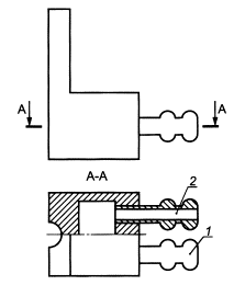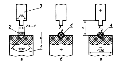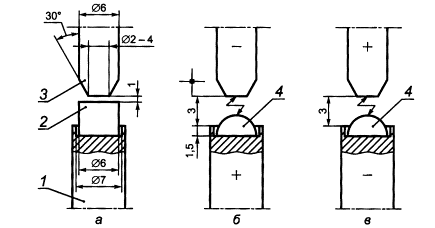 1 - штуцер для входа охлаждающей воды; 2 - штуцер для выхода охлаждающей воды Рисунок 4 - Электрододержатели - электроды графитовые из спектральных углей марки ОСЧ или С-3 в виде прутков (в соответствии с рисунком 5) со штифтообразной заточкой с площадкой диаметром 3 мм. а - до экспонирования; б - при анодной полярности таблетки; в - при катодной полярности таблетки 1 - графитовый электрод-подставка; 2 - таблетка пробы или стандартного образца; 3 - графитовый электрод; 4 - капля расплава Рисунок 5 - Графитовые электроды При выполнении анализа применяют следующие материалы, растворы: - вату медицинскую гигроскопическую по ГОСТ 5556; - бумагу масштабно-координатную марки ЛН по ГОСТ 334; - воду дистиллированную по ГОСТ 6709; - воду деионизированную, полученную пропусканием дистиллированной воды через ионообменную колонку с катионитом (например, марки КУ-2-8), или воду бидистиллированную; - катионит марки КУ-2-8 по ГОСТ 20298; - кислоту азотную особой чистоты по ГОСТ 11125 или кислоту азотную по ГОСТ 4461 (перегнанную в установке), разбавленную 1:1, 2:1; - спирт этиловый по ГОСТ 18300; - СО состава меди. 20.5 Метод анализа Метод основан на измерении интенсивностей спектральных линий определяемых элементов спектрометром. Спектр излучения возбуждается дугой постоянного тока между подставным графитовым электродом и таблеткой оксида меди, полученной путем растворения пробы в азотной кислоте и термического разложения образовавшихся солей. 20.6 Подготовка к выполнению анализа 20.6.1 Подготовка прибора Подготовку прибора к выполнению измерений проводят в соответствии с требованиями действующей инструкции по эксплуатации спектрометра. Спектрометр градуируют при создании метода с использованием СО состава меди и строят зависимость интенсивности аналитической линии от массовой доли для каждого определяемого элемента. При дальнейшей работе выполняют корректировку градуировочных характеристик в соответствии с инструкцией по эксплуатации спектрометра. 20.6.2 Приготовление синтетических смесей, которые могут использоваться в качестве СО для градуировки, приведено в Приложении А. 20.6.3 Перед выполнением измерений ступку, пресс-форму, чаши и пинцет протирают спиртом. Расход спирта на одно определение - 10 см3. После сжигания каждой пробы электрододержатели также протирают спиртом. От пробы отбирают две навески массой от 5 до 10 г. Навески помещают в выпаривательные чаши, приливают азотную кислоту, разбавленную 1:1, из расчета от 8 до 10 см3 кислоты на 1 г пробы, и растворяют при нагревании. Полученные растворы выпаривают досуха, чаши с сухими солями помещают в печь и прокаливают при температуре (500 ±25)°С в течение 30 мин с момента прекращения выделения паров оксида азота. Полученный оксид меди растирают в ступке. Отбирают по три навески массой 0,500 г от порошков оксида меди, полученных из каждой исходной навески пробы, и прессуют таблетки (предварительно пресс-форма должна быть очищена и протерта спиртом). Допускается изменение массы порошка для изготовления таблеток от 0,500 до 1,000 г с целью достижения нижних границ диапазона массовых долей определяемых элементов. Образцы для градуировки в виде оксидных порошков также прессуют в таблетки. Массы порошка при изготовлении таблеток для градуировки и для измерения массовой доли примеси в анализируемой пробе должны быть одинаковыми. Подгото