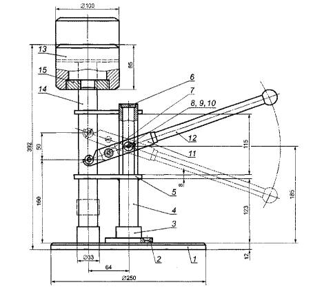 1 - основание, 2 - болт, 3 - пята, 4 - стальная труба, 5 - соединительная пластина, б - заглушка, 7 - запасная ось, 8 - малая ось, 9 - шайба, 10 - шплинт, 11 - несущий рычаг, 12 - рукоятка, 13 - груз пресса, 14 - облегченный вертикальный вал, 15 - вставка Рисунок 4 - Пресс, используемый для сжатия смеси антрацита и испытуемого угля 6.7 Электрическая печь с зоной равномерного нагрева, с терморегулятором для контроля и поддержания температуры в этой зоне (850 ± 10) °С. 6.8 Барабан с крышкой, приводным валом, редуктором и электродвигателем для проведения испытания кокса на истираемость. Барабан (см. рисунок 5) имеет внутренний диаметр
