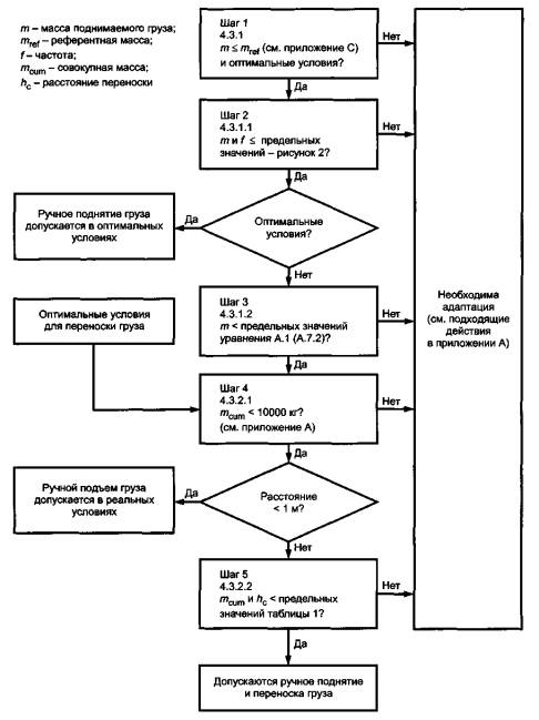 Для повторяющихся работ в оптимальных условиях шаг 2 должен быть удовлетворительным, в противном случае переходят к шагу 3. 4.3.1.2 Рекомендуемые предельные значения массы, частоты, положения (шаг 3) Для определения рекомендуемых предельных значений массы груза с учетом рабочего положения груза, частоты поднятия и продолжительности грузоподъемных работ необходимо использовать уравнение (А.1) (приложение А). По указанному уравнению в А.7 (приложение А) сделаны допущения, которые должны быть приняты во внимание. Если предельные значения для ручной обработки превышены, следует задача адаптации массы груза, частоты поднятия, продолжительности грузоподъемных работ или положения груза. 4.3.2 Совокупная масса поднятия и переноски Для рассмотрения совокупной массы поднятия и переноски груза за рабочий день (см. рисунок 1, шаг 4, и 4.3.2.1) следует использовать рекомендуемые в 4.3.1.1 предельные значения. Для определения совокупной массы перенесенного груза (с учетом расстояния перемещения) (см. рисунок 1, шаг 5) следует обратиться к 4.3.2.2, где для груза, переносимого на небольшое расстояние (один или два шага), применяют предельные значения для поднятия, также дают предельные значения для совокупной массы груза за 1 ч и за восьмичасовой рабочий день. 4.3.2.1 Рекомендуемые предельные значения совокупной массы за смену (шаг 4) Совокупную массу вычисляют как произведение массы и частоты поднятия. Эти оба параметра определяют шагами 1 и 2: единичная масса груза не должна превышать 25 кг, частота поднятия не должна превышать 15 раз/мин. При оптимальных условиях предельные значения совокупной массы перенесенного груза - 10000 кг за 8 ч. В случае значительного расстояния переноски (более 20 м) этот предел должен быть уменьшен до 6000 кг за 8 ч. 4.3.2.2 Рекомендуемые предельные значения совокупной массы, связанной с расстоянием (шаг 5) Для ручной переноски в оптимальных условиях рекомендуемые предельные значения совокупной массы груза с учетом расстояния переноски представлены в таблице 1: - в килограммах в минуту - для обеспечения защиты от превышения массы единичного груза; - в килограммах в час - для обеспечения защиты от превышения суммарной массы груза; - в килограммах за 8 ч - для ограничения долгосрочного риска. Предельные значения не просто увеличиваются, так как риск для небольшого периода времени, среднего периода и длительные риски качественно различны. Таблица 1 - Рекомендуемые предельные значения совокупной массы, связанной с переноской груза на расстояние (для основной группы работников)