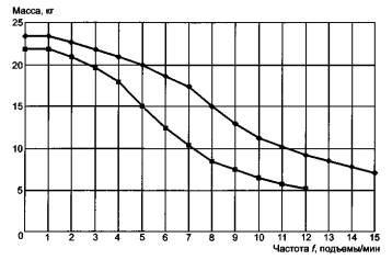 На каждом последующем шаге необходимо оценивать взаимосвязанные аспекты различных задач. Это сопряжено с тем, что работодатель, руководители и специалисты должны предоставлять работникам адекватную информацию о трудовом процессе и рабочей среде, обеспечивать их обучение и профессиональную подготовку для всех ситуаций, рассматриваемых в настоящем стандарте. Работники могут содействовать снижению уровня профессиональных рисков соблюдением трудовой и технологической дисциплин, выполнением государственных нормативных требований охраны труда, применением безопасных методов ручной обработки грузов. Оценку риска проводят в четыре этапа: обнаружение опасности, идентификация опасности, определение риска и оценка риска в соответствии с международными стандартами [2], [3] и [4]. Информация по идентификации опасности приведена в приложении А. 4.3 Определение и оценка рискаАлгоритм (см. рисунок 1) отражает процедуру определения взаимосвязанных параметров при ручной обработке грузов, изложенную в 4.3.1, 4.3.2. В случае превышения предельных значений массы груза должны быть приняты меры к исключению ручной обработки грузов, либо задача должна быть изменена так, чтобы удовлетворялись все этапы в алгоритме оценки риска. Главная цель снижения уровня профессиональных рисков состоит в сохранении здоровья и обеспечении безопасности работника через выработку и реализацию технических и организационных мер по совершенствованию в целом проекта погрузочно-разгрузочных работ в комплексе с улучшением параметров производственной среды и трудового процесса и учетом индивидуальных возможностей работника. Первым шагом при нерегулярных поднятиях груза в оптимальных условиях является определение массы груза (шаг 1). Референтные значения массы груза приведены в приложении С. Шаг 1 определяет общие показатели, необходимые для проектировщиков и производственников. Методологические положения приведены в А.7.1 (приложение А). Рассмотрение процесса поднятия груза, осуществляемого в режиме повторяющихся операций, требует определения массы груза в комбинации с частотой поднятия (см. рисунок 1, шаг 2, и пункт 4.3.1.1). Если предельные значения массы и частоты поднятия груза не превышены, переходят к шагу 3. В противном случае необходима адаптация условий работы (см. приложение А). Для шага 3, при рассмотрении реальных условий работы, следует применять положения 4.3.1.2. В шаге 4 рассматривается совокупная масса груза, обработанного за рабочий день; рекомендуемые предельные значения приведены в 4.3.2.1. 4.3.1.1 Рекомендуемые предельные значения массы и частоты (шаг 2) Графики (см. рисунок 2) предельных значений массы груза в зависимости от частоты поднятия для повторяющихся работ при их продолжительности в течение рабочего дня: не более одного часа и от одного до двух часов показывают, что при массе груза 7 кг и частоте 15 поднятий в минуту общая продолжительность грузоподъемных работ не должна превышать 1 ч вдень.