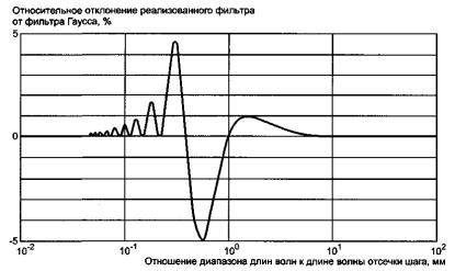 Рисунок 3 - Передаточная характеристика коротковолновой составляющей профиля 5 Пределы погрешности фазокорректированных фильтровДля фазокорректированных фильтров значения допусков передаточной характеристики и весовой функций не установлены. Отклонение реализованного фазокорректированного профиля от Гауссова фильтра представляют графически в пределах диапазона длин волн от 0,01lВ до 100lВ. Пример кривой отклонений приведен на рисунке 4.