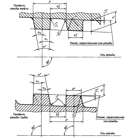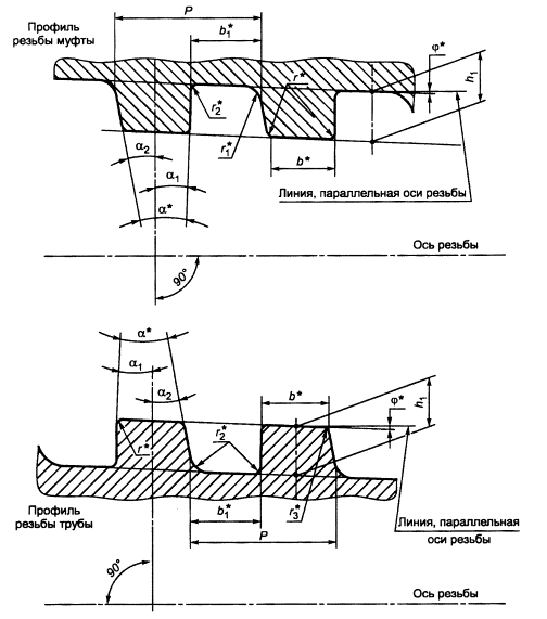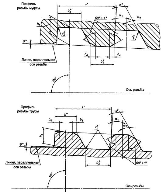 ________________ * Размер для справок. α - угол профиля; α1, α2 - углы наклона сторон профиля; b - ширина вершин профиля трубы, b1 - ширина вершин профиля муфты; b2 - ширина впадин профиля трубы; b3 - ширина впадин профиля муфты; b4 - ширина фаски вершин профиля; h1 - высота профиля; Р - шаг резьбы; r1 - радиус скругления впадин профиля, r2 - радиус скругления вершин профиля; φ - угол уклона резьбы Примечание - Допускается замена фаски вершин профиля скруглением вершин радиусом, равным (0,2 +0,05) мм. Рисунок 11 - Форма и геометрические параметры профиля трапецеидальной резьбы соединения НКМ насосно-компрессорных труб условным диаметром от 60 до 102 мм включительно и муфт к ним