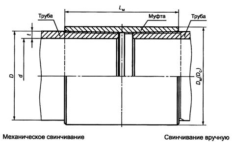5.3.3 На расстоянии менее (l - 10) мм от торца трубы не допускаются витки резьбы с черновинами. На расстоянии (l - 10) мм и более от торца трубы допускаются витки с черновинами общей протяженностью на каждом витке не более 25% длины витка резьбы: - на одном витке резьбы -для труб условным диаметром до 194 мм включительно; - на двух витках резьбы - для труб условным диаметром 219 мм и более. 5.3.4 Минимальная толщина стенки трубы под резьбой в плоскости торца трубы должна быть не менее 3,0 мм, кроме труб следующих размеров, для которых минимальная толщина стенки трубы под резьбой в плоскости торца трубы должна быть не менее 2,5 мм: - труб условным диаметром 146 мм и толщиной стенки 8,5 мм, - труб условными диаметрами 168, 219, 245 и 273 мм и толщинами стенки 8,0 и 8,9 мм, - труб условным диаметром 324 мм и толщиной стенки 9,5 мм. Толщину стенки трубы под резьбой в плоскости торца трубы вычисляют по следующей формуле