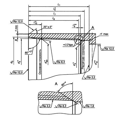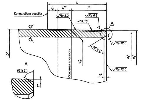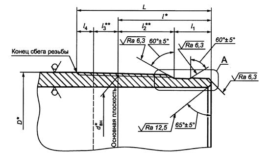 _________________ * Размер для справок. ** Размер не регламентируется, D - наружный диаметр трубы; dBH - внутренний диаметр резьбы в основной плоскости; d1 - наружный диаметр резьбы в плоскости торца трубы; d2 - диаметр уплотнительной конической проточки в плоскости торца трубы; L - расстояние от торца до конца сбега резьбы; l - длина резьбы от торца трубы до основной плоскости; l1 - длина резьбы с полным профилем; 12 – длина резьбы с неполным профилем; l3 - длина сбега резьбы Рисунок 7 - Основные геометрические параметры резьбового соединения ОТТГ трубы