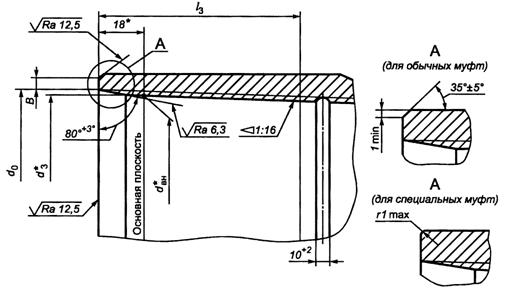_________________ * Размер для справок. В - ширина торцовой плоскости обычной муфты; dBH - внутренний диаметр резьбы в основной плоскости; dQ - диаметр фаски в плоскости торца муфты; d3 - внутренний диаметр резьбы в плоскости торца муфты; l3 - длина резьбы с полным профилем муфты; r - радиус скругления кромки торца специальной муфты Примечания 1. Для выхода резьбообразующего инструмента на середине муфты может быть выполнена проточка глубиной, превышающей высоту профиля резьбы h1 не более чем на 0,50 мм. Проточка не должна иметь острых кромок. При отсутствии проточки допускается перерез встречных ниток в середине муфты на длине резьбы с неполным профилем. 2 Для специальных муфт допускается замена фаски 35° ±5° скруглением кромки торца радиусом, не превышающим ширину фаски. Рисунок 4 - Основные геометрические параметры резьбового соединения ОТТМ муфты Таблица 4 - Основные геометрические параметры резьбового соединения ОТТМ муфты В миллиметрах