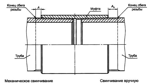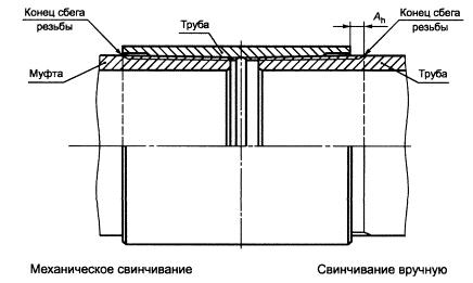 где tr - толщина стенки трубы под резьбой в плоскости торца трубы, мм, округленная до 0,1 мм; r - номинальная толщина стенки, мм; D - номинальный наружный диаметр трубы, мм; d2 - внутренний диаметр резьбы в плоскости торца трубы, мм; Δ - величина плюсового предельного отклонения наружного диаметра трубы, равная 0,8 мм для труб условным диаметром до 102 мм включительно и 0,9 мм для труб условным диаметром 114 мм. Если расчетное значение tr менее или равно 1,0 мм для труб условным диаметром до 48 мм включительно и менее или равно 2,0 мм для труб остальных диаметров, то минимальная толщина стенки трубы под резьбой в плоскости торца трубы должна быть не менее 1,0 или 2,0 мм соответственно, Если расчетное значение tr более 1,0 мм для труб условным диаметром до 48 мм включительно или более 2,0 мм для труб остальных диаметров, то минимальная толщина стенки трубы под резьбой в плоскости торца трубы должна быть не менее расчетного значения. 6.2.5 Оси резьбы обоих концов муфты должны совпадать. Предельное отклонение от соосности в плоскости торца муфты не должно превышать 0,75 мм, предельное отклонение от соосности на расстоянии 1 м от середины муфты не должно превышать 3,00 мм. Допускается увеличение предельного отклонения от соосности в плоскости торца муфты до 1,00 мм при одновременном уменьшении предельного отклонения от соосности на расстоянии 1 м от середины муфты до 2,00 мм. 6.2.6 Овальность резьбы муфты (разность диаметров резьбы муфты в одном сечении) не должна превышать: - 0,100 мм - для муфт к трубам условным диаметром от 27 до 60 мм; - 0,130 мм - для муфт к трубам условным диаметром от 73 до 89 мм; - 0,150 мм - для муфт к трубам условным диаметром от 102 до 114 мм. 6.2.7 При свинчивании труб с муфтами вручную натяг Ah (расстояние от торца муфты до конца сбега резьбы на трубе) (рисунок 17) должен соответствовать указанному в таблицах 12 и 14. При механическом свинчивании труб с муфтами торец муфты должен совпадать с концом сбега резьбы на трубе (см. рисунок 17).