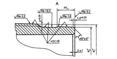 где tr - толщина стенки трубы под резьбой в плоскости торца трубы, мм, округленная до 0,1 мм; t - номинальная толщина стенки, мм; D - номинальный наружный диаметр трубы, мм; Δ - величина плюсового предельного отклонения наружного диаметра трубы, равная 0,8 мм для труб условным диаметром до 102 мм включительно и 0,9 мм для труб условным диаметром 114 мм; d2 - диаметр уплотнительной конической проточки в плоскости торца трубы, мм. Если расчетное значение tr менее или равно 1,8 мм, а для труб условными диаметрами 73 и 60 мм с толщиной стенки 5,5 мм соответственно менее или равно 1,5 и 1,2 мм, то минимальная толщина стенки трубы под резьбой в плоскости торца трубы должна быть не менее 1,8, 1,5 и 1,2 мм, соответственно. Если расчетное значение tr более 1,8 мм, а для труб условными диаметрами 73 и 60 мм толщиной стенки 5,5 мм соответственно более 1,5 и 1,2 мм, то минимальная толщина стенки трубы под резьбой в плоскости торца трубы должна быть не менее расчетного значения. 6.3.5 Предельные отклонения конусности на всей длине уплотнительной конической проточки трубы не должны превышать ±0,03 мм, уплотнительной конической расточки муфты не должны превышать +0,06 мм. 6.3.6 Упорные торцы трубы и упорные уступы муфты должны быть плоскими и перпендикулярными к оси резьбы. Предельное отклонение упорных элементов от перпендикулярности не должно превышать 0,06 мм. Предельное отклонение упорных элементов от плоскостности не должно превышать 0,06 мм. 6.3.7 Овальность резьбы муфты (разность диаметров резьбы муфты в одном сечении) не должна превышать: - 0,100 мм - для муфт к трубам условным диаметром от 27 до 60 мм включительно; - 0,130 мм - для муфт к трубам условным диаметром от 73 до 89 мм включительно; - 0,150 мм - для муфт к трубам условным диаметром от 102 до 114 мм включительно. 6.3.8 Оси резьбы обоих концов муфты должны совпадать. Предельное отклонение от соосности резьбы в плоскости торца муфты не должно превышать 0,75 мм, предельное отклонение от соосности резьбы на расстоянии 1 м от середины муфты не должно превышать 3,00 мм. 6.3.9 Оси резьбы и уплотнительных элементов труб и муфт должны совпадать. Предельное отклонение от соосности в плоскости торца трубы или муфты не должно превышать 0,04 мм. 6.3.10 При свинчивании труб с муфтами вручную натяг Ah (расстояние от торца муфты до конца сбега резьбы на трубе) (рисунок 21) должен быть равен указанному в таблице 16.