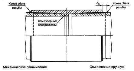 Ah - натяг муфт с трубами при свинчивании вручную Рисунок 21 - Схема свинчивания муфт и труб с резьбовым соединением НКМ При механическом свинчивании трубы с муфтой должно быть обеспечено сопряжение упорного торца трубы и упорного уступа муфты по всему периметру стыка упорных поверхностей (рисунок 21). 7 Контроль резьбовых соединений7.1 Порядок контроля7.1.1 Контроль резьбовых соединений должен быть проведен изготовителем изделий с резьбовыми соединениями или предприятием, нарезающим резьбу. Допускается контроль резьбовых соединений представителем заказчика. 7.1.2 Контроль резьбового соединения включает контроль качества поверхности, полноты нанесения покрытия, геометрических параметров резьбы и элементов резьбовых соединений, для которых установлены предельные отклонения, а также контроль натяга и сопряжения при свинчивании резьбовых соединений. Контролю качества поверхности резьбы и элементов резьбовых соединений подвергают каждую трубу и каждую муфту партии. Контролю шероховатости поверхности резьбы, упорных и уплотнительных элементов труб и муфт подвергают 1% изделий. Контролю полноты нанесения покрытия подвергают каждую муфту. Остальным видам контроля подвергают: а) не менее 1% муфт - при контроле соосности резьбы муфты; б) не менее 1% труб и муфт - при контроле соосности резьбы и уплотнительных элементов; в) каждое резьбовое соединение - при контроле натяга трубы и муфты при свинчивании вручную (только при выполнении заказа на трубы с муфтами, свинченными вручную); г) каждое резьбовое соединение - при контроле натяга трубы и муфты при механическом свинчивании; д) каждое резьбовое соединение - при контроле сопряжения упорных поверхностей трубы и муфты при механическом свинчивании; е) каждую трубу и муфту - при контроле натяга калибрами. Контроль калибрами резьбы и уплотнительной конической расточки муфты допускается проводить до нанесения покрытия. Контроль остальных геометрических параметров резьбы и элементов резьбовых соединений, для которых установлены предельные отклонения, проводят в объемах и с периодичностью, установленными в технологической документации изготовителя. 7.2 Контроль качества поверхности и геометрических параметров7.2.1 Контроль качества поверхности резьбы, упорных и уплотнительных элементов резьбовых соединений труб и муфт проводят визуально без применения увеличительных приспособлений. 7.2.2 Шероховатость резьбы, упорных и уплотнительных элементов труб и муфт проверяют методом сравнения с применением образцов шероховатости поверхности по ГОСТ 9378. 7.2.3 Полноту нанесения цинкового или фосфатного покрытия на поверхность резьбы и уплотнительных конических расточек муфты контролируют визуально без применения увеличительных приспособлений. 7.2.4 Контроль геометрических параметров проводят с использованием универсальных или специальных средств измерений, обеспечивающих необходимую точность измерений, в соответствии с нормативными и техническими документами, утвержденными в установленном порядке. При проведении контроля соблюдают следующие условия: - перед контролем проверяемую поверхность тщательно очищают; - контроль параметров резьбы и уплотнительной конической расточки муфты проводят перед нанесением или после удаления покрытия химическим способом; - контроль проводят до 