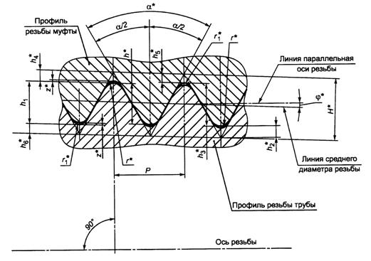 _______________ * Размер для справок. α - угол профиля; α/2 - угол наклона стороны профиля; φ - угол уклона резьбы; Н - высота исходного профиля; h - рабочая высота профиля; h1, h3 - высота профиля; h2, h4 - срез по вершинам профиля резьбы трубы и муфты; h5, h6 - срез по впадинам профиля резьбы трубы и муфты; Р - шаг резьбы; r1 - радиус скругления впадины профиля; r - радиус скругления вершины профиля; z - зазор Рисунок 10 - Форма и геометрические параметры профиля закругленной треугольной резьбы соединений Таблица 7 - Геометрические параметры профиля закругленной треугольной резьбы соединений НКТ и НКТВ В миллиметрах