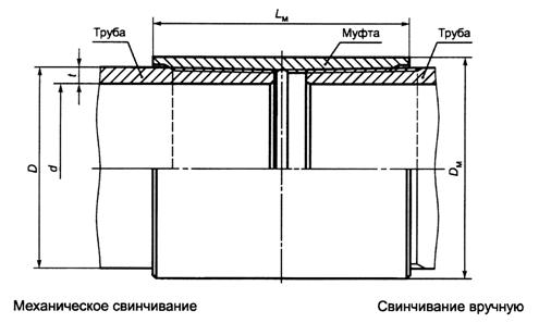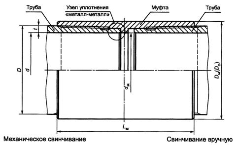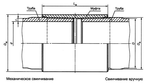 D - наружный диаметр трубы; DM - наружный диаметр муфты; d - внутренний диаметр трубы; LM - длина муфты; t - толщина стенки трубы Рисунок 13 - Общий вид резьбового соединения НКТ