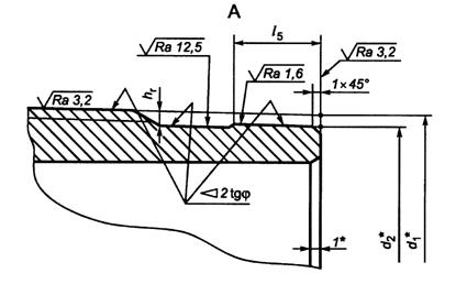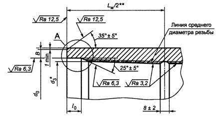 5.2.3 `На расстоянии менее (l - 10) мм от торца трубы не допускаются витки резьбы с черновинами. На расстоянии (l - 10) мм и более от торца трубы допускаются витки резьбы с черновинами общей протяженностью на каждом витке не более 25% длины витка резьбы: - на одном витке резьбы - для труб условным диаметром до 194 мм включительно; - на двух витках резьбы - для труб условным диаметром 219 мм и более. 5.2.4 Минимальная толщина стенки трубы под резьбой в плоскости торца трубы должна быть не менее 1,5 мм. Толщину стенки трубы под резьбой в плоскости торца трубы вычисляют по следующей формуле