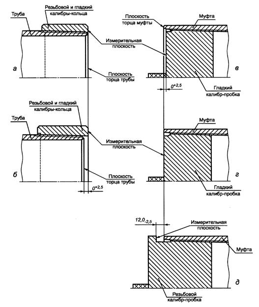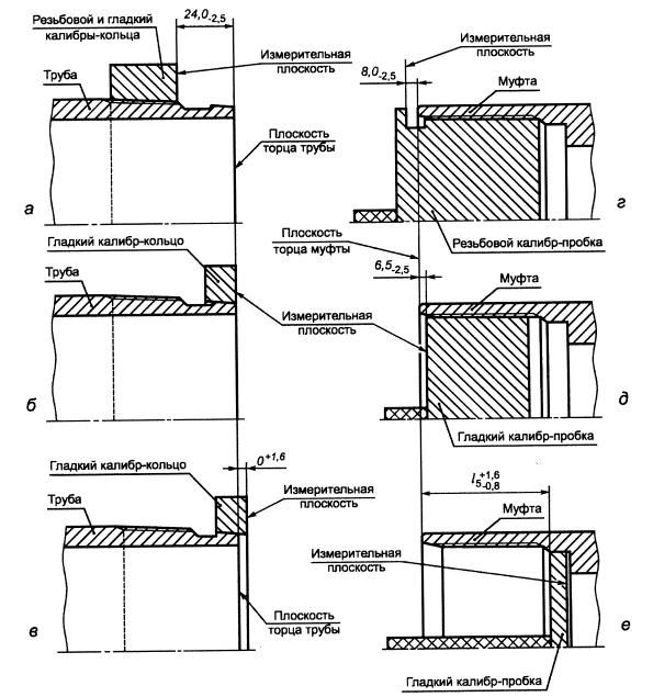 l5 - расстояние от торца муфты до конца сбега резьбы Рисунок 23 - Схема контроля калибрами резьбового соединения ОТТГ Натяг резьбы трубы, определяемый как расстояние между плоскостью торца трубы и измерительной плоскостью резьбового или гладкого калибров-колец, должен быть равен (24,0-2,5) мм (рисунок 23 а). Натяг уплотнительной конической проточки трубы, определяемый как расстояние между плоскостью торца трубы и измерительной плоскостью гладкого калибра-кольца, должен быть равен (0+1,6) мм (рисунок 23 б и в). Натяг резьбы муфты, определяемый как расстояние между плоскостью торца муфты и измерительной плоскостью резьбового калибра-пробки, должен быть равен (8,0-2,5) мм (рисунок 23 г). Натяг резьбы муфты, определяемый как расстояние между плоскостью торца муфты и измерительной плоскостью гладкого калибра-пробки, должен быть равен (6,5-2,5) мм (рисунок 23 д). Натяг уплотнительной