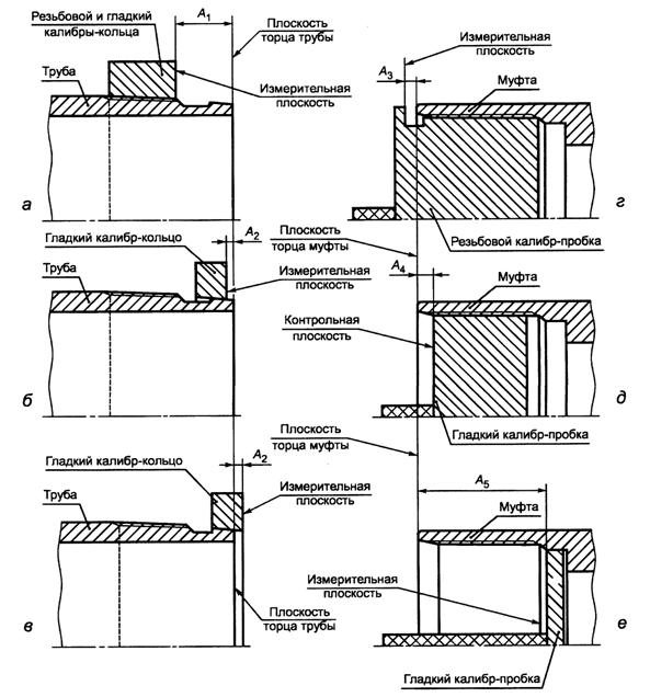 А1 - натяг резьбы трубы по резьбовому или гладкому калибрам-кольцам; А2 - натяг уплотнительной конической проточки трубы по гладкому калибру-кольцу; А3 - натяг резьбы муфты по резьбовому калибру-пробке; А4 - натяг резьбы муфты по гладкому калибру-пробке; А5 - натяг уплотнительной конической расточки муфты по гладкому калибру-пробке Рисунок 25 - Схема контроля калибрами резьбового соединения НКМ Натяг резьбы трубы А1, определяемый как расстояние между плоскостью торца трубы и измерительной плоскостью калибра (рисунок 25 а), должен быть равен: а) (20-1,2) мм - при контроле резьбовым калибром-кольцом труб условным диаметром от 60 до 102 мм включительно; б) (20-2,4) мм - при контроле гладким калибром-кольцом труб условным диаметром от 60 до 102 мм включительно; в) (20-2,5) мм - при контроле гладким и резьбовым калибрами-кольцами труб условным диаметром 114 мм. Натяг уплотнительной конической проточки трубы А2, определяемый как расстояние между плоскостью торца трубы и измерительной плоскостью гладкого калибра-кольца (рисунок 25 б и в), должен быть равен: а) (0+1,2) - при контроле труб условным диаметром от 60 до 102 мм включительно; б) (0-1,6) - при контроле труб условным диаметром 114 мм. Натяг резьбы муфты A3, определяемый как расстояние между плоскостью торца муфты и измерительной плоскостью резьбового калибра-пробки (рисунок 25 г), должен быть равен: а) (5,0-1,2) мм - при контроле муфт к трубам условным диаметром от 60 до 102 мм включительно; б) (6,0-2,5) мм - при контроле муфт к трубам условным диаметром 114 мм. Натяг резьбы муфты А4, определяемый как расстояние между плоскостью торца муфты и измерительной плоскостью гладкого калибра-пробки (рисунок 25 д), должен быть равен: в) (0-1,2) мм - при контроле муфт к трубам условным диаметром от 60 до 102 мм включительно; г) (8,5-2,5) мм - при контроле муфт к трубам условным диаметром 114 мм. Натяг уплотнительной конической расточки муфты А5, определяемый как расстояние между плоскостью торца муфты и измерительной плоскостью гладкого калибра-пробки (рисунок 25 е), должен быть равен: а) (45-1,2) мм - при контроле муфт к трубам условным диаметром 60 и 73 мм; б) (55-1,2) мм - при контроле муфт к трубам условным диаметром 89 и 102 мм; в) ( Ключевые слова: насосно-компрессорные трубы, обсадные трубы, муфты, соединения, треугольная резьба, трапецеидальная резьба, высокогерметичное соединение, узел уплотнения, требования, приемка, контроль