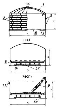 1 - каркас крыши; 2 - пояса стенки; 3 - промежуточные кольца жесткости; 4 - кольцо окраек; 5 - центральная часть днища; 6 - понтон; 7 - опорные стойки; 8 - уплотняющий затвор; 9 - катучая лестница; 10 - плавающая крыша; 11 - верхнее кольцо жесткости (площадка обслуживания) Рисунок 1 - Типы резервуаров Рекомендуемые размеры резервуаров приведены в таблице 1. Таблица 1 - Рекомендуемые размеры резервуаров