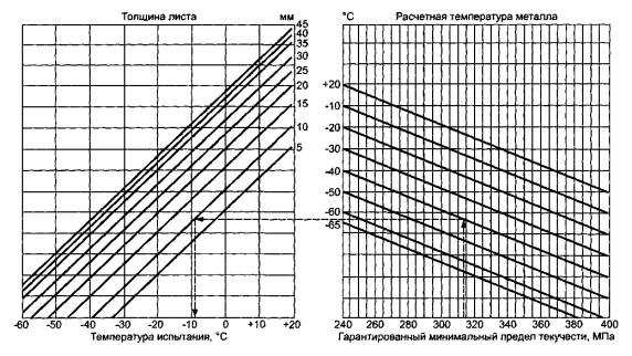 где С, Mn, Si, Cr, Mo, Ni, Сu, V, P - массовые доли, % углерода, марганца, кремния, хрома, молибдена, никеля, меди, ванадия и фосфора, по результатам плавочного анализа. Значения углеродного эквивалента Сэ стали должны указываться в проектной документации и при заказе металлопроката. 5.2.1.6 Для применяемых сталей соотношение предела текучести и временного сопротивления σт/σв не должно превышать: 0,75 - для сталей σт ≤440 МПа; 0,85 - для сталей σт > 440 МПа. 5.2.1.7 Требования к стали для вспомогательных конструкций должны соответствовать строительным нормам и правилам для строительных стальных конструкций с учетом условий эксплуатации, действующих нагрузок и климатических воздействий. 5.2.1.8 Материалы для сварки (электроды, сварочная проволока, флюсы, защитные газы) должны выбираться в соответствии с требованиями технологического процесса изготовления и монтажа конструкций и выбранных марок стали. При этом применяемые сварочные материалы и технология сварки должны обеспечивать механические свойства металла сварных соединений не ниже свойств, установленных требованиями для выбранных марок стали. Для сварных соединений из стали с гарантированным минимальным пределом текучести 305-440 МПа твердость HV металла шва и околошовной зоны не должна превышать 280 ед. 5.2.2 Расчетная температура металла 5.2.2.1 За расчетную температуру металла необходимо принимать наиболее низкое из двух следующих значений: - минимальная температура складируемого продукта; - температура наиболее холодных суток для данной местности (минимальная среднесуточная температура), повышенная на 5 °С. Примечание - При определении расчетной температуры металла не принимаются во внимание температурные эффекты специального обогрева и теплоизолирования резервуара. 5.2.2.2 Температура наиболее холодных суток для данной местности определяется с обеспеченностью 0,98 для температур наружного воздуха по [5], таблица 1. 5.2.2.3 Для резервуаров рулонной сборки расчетную температуру металла следует принимать по 5.2.2.1; при толщинах от 10 до 14 мм включ. понижают на 5 °С; то же - при толщинах свыше 14 мм - на 10 °С. 5.2.3 Требования к ударной вязкости 5.2.3.1 Требования к ударной вязкости стали для элементов основных конструкций групп А и Б назначаются в зависимости от группы конструкций, расчетной температуры металла, механических свойств стали и толщины проката. 5.2.3.2 Для элементов основных конструкций группы А из стали с гарантированным минимальным пределом текучести 390 МПа и менее температуру испытаний необходимо определять по номограмме (см. рисунок 2) с учетом предела текучести стали, толщины металлопроката и расчетной температуры металла. При использовании стали с пределом текучести более 390 МПа температуру испытаний следует принимать равной расчетной температуре металла. Для основных конструкций групп Б1 и Б2 температура испытаний определяется по номограмме (см. рисунок 2) с повышением данной температуры на 10 °С. 5.2.3.3 Для элементов конструкций групп А и Б1 обязательным является определение значения ударной вязкости KCV, а для элементов группы Б2 - KCU, при заданной (см. 5.2.3.2) температуре испытаний. Нормируемые значения ударной вязкости KCV и KCU листового проката на поперечных образцах зависят от гарантированного минимального предела текучести стали. Для стали с пределом текучести 360 МПа и менее ударная вязкость должн