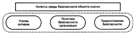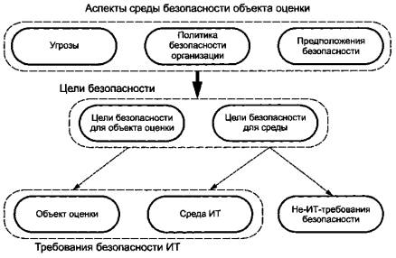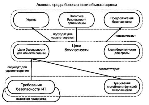 Рисунок 1 - Определение аспектов среды безопасности объекта оценки В данном разделе предметом рассмотрения становятся следующие аспекты: a) предположения относительно среды безопасности ОО; b) активы, требующие защиты (обычно информация или ресурсы в пределах ИТ-среды или непосредственно ОО), идентифицированные источники угроз и сами угрозы, которые они порождают для активов; c) ПБОр или правила, которым должен соответствовать ОО. Следующие разделы ПЗ и ЗБ показывают, как аспекты безопасности среды ОО будут удовлетворяться объектом оценки и его средой. Именно поэтому важно обеспечить ясную и краткую формулировку аспектов безопасности среды ОО. При определении аспектов среды безопасности следует избегать (где возможно) описания того, как ОО учитывает аспекты безопасности среды. Такой подход позволяет акцентировать внимание пользователя ПЗ и ЗБ на наиболее важных аспектах безопасности среды ОО. 8.2 Идентификация и спецификация предположений безопасностиВ соответствии со стандартами серии ИСО/МЭК 15408 в раздел «Среда безопасности ОО» ПЗ и ЗБ необходимо включать перечень предположений относительно среды безопасности ОО или предполагаемого использования ОО. Для формирования такого перечня необходимо определить характер предположений относительно среды безопасности ОО и ее границы. Например, может потребоваться сформулировать предположения, связанные с тем, что потенциальные угрозы практически не оказывают влияния на безопасность активов среды ОО. В ПЗ и ЗБ целесообразно включать следующие группы предположений: a) предположения относительно будущего использования ОО; b) предположения, связанные с защитой любой части ОО со стороны среды (например, физическая защита); c) предположения связности [например, межсетевой экран должен быть единственным сетевым соединением между частной (защищаемой) и внешней (потенциально враждебной) сетью]; d) предположения, имеющие отношение к персоналу [например, предполагаемые пользовательские роли, основные обязанности (ответственность) пользователей и степень доверия этим пользователям]. Кроме того, в ПЗ и ЗБ целесообразно включать и другие предположения, оказывающие существенное влияние на содержание ПЗ и ЗБ, например, предположения, определяющие выбор требований доверия к безопасности. Необходимо помнить, что все идентифицированные предположения безопасности должны быть учтены при формировании целей безопасности. Предположения безопасности, которые по какой-либо причине не могут быть учтены при формировании целей безопасности, целесообразно включать в ПЗ и ЗБ в качестве сопроводительной информации. Чаще всего с первого раза невозможно полностью идентифицировать все предположения. Поэтому предположения могут быть дополнительно идентифицированы на протяжении всего периода разработки ПЗ или ЗБ. В частности, при формировании раздела ПЗ и ЗБ «Обоснование» (например, при демонстрации пригодности целей безопасности для противостояния идентифицированным угрозам) необходимо установить, были ли сделаны предположения, не нашедшие своего отображения в ПЗ и ЗБ. Наряду с использованием итерационного подхода к идентификации предположений безопасности, необходимо избегать включения в раздел «Среда безопасности ОО» любых предположений, связанных с эффективным использованием ко