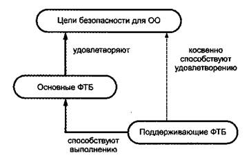 Рисунок 4 - Взаимосвязь основных и дополнительных функциональных требований безопасности Идентификация поддерживающих ФТБ представляет собой итерационный процесс, например: a) предположим, что ПЗ включает в себя цель безопасности, требующую, чтобы ОО определенным образом реагировал на события, являющиеся показателем предстоящего нарушения безопасности. Наличие в ПЗ подобной цели предполагает идентификацию основного ФТБ на базе компонента FAU_ARR1 «Сигналы нарушения безопасности»; b) компонент FAU_ARP.1 имеет зависимость от компонента FAU_SAA.1 «Анализ потенциальных нарушений», который также должен быть включен в ПЗ в качестве поддерживающего ФТБ; c) компонент FAU_SAA.1 имеет зависимость от FAU_GEN.1 «Генерация данных аудита»; d) компонент FAU_GEN.1 имеет зависимость от FPT_STM.1 «Надежные метки времени»; e) компонент FPT_STM.1 не требует ввода дополнительных функциональных компонентов. Некоторые зависимости могут быть оставлены неудовлетворенными. При этом необходимо пояснить, почему соответствующие ФТБ не требуются для удовлетворения целей безопасности. При удовлетворении зависимостей необходимо обеспечить согласованность соответствующих компонентов. Например, в случае FAU_ARR1 согласованность достигается характером требований (FAU_ARP1 зависит от ожидания потенциального нарушения безопасности, которое определено применением FAU_SAA.1.2). Для других компонентов согласованность может быть более проблематичной. Например, при включении в ПЗ компонента FDP_ACC1 одновременно идентифицируется конкретная политика управления доступом. При удовлетворении зависимости FDP_ACC1 от компонента FDP_ACF1 необходимо обеспечить применение FDP_ACF.1 к той же политике управления доступом, которая идентифицировалась при включении в ПЗ компонента FDP_ACC1. Если к компоненту FDP_ACC1 применяется операция «итерация» для различных политик управления доступом, то зависимость от компонента FDP_ACF.1 должна быть удовлетворена несколько раз, принимая во внимание каждую политику управления доступом. Идентификация дополнительных поддерживающих ФТБ (то есть тех. которые не требуются для удовлетворения зависимостей) включает в себя идентификацию любых других ФТБ, которые считаются необходимыми для содействия достижению целей безопасности для ОО. Такие ФТБ должны способствовать достижению целей безопасности для ОО путем уменьшения доступных нарушителю возможностей для атак Кроме того, реализация дополнительных поддерживающих ФТБ может потребовать от нарушителя более высокого уровня подготовки и значительных ресурсов для проведения результативной атаки. В качестве дополнительных ФТБ могут выступать: a) ФТБ, основанные на соответствующих компонентах того же класса, что и основные ФТБ. Напри мер, если компонент FAUGEN.1 «Генерация данных аудита» включен в ПЗ, то может возникнуть необходимость в создании и ведении журнала аудита безопасности для хранения сгенерированных данных (для формулирования подобного требования необходим один или более функциональных компонентов из семейства FAU_STG), а также потребность в средствах просмотра сгенерированных данных аудита (для формулирования подобного требования необходим один или более функциональных компонентов из семейства FAU_SAR). В качестве альтернативы включению поддерживающих ФТБ, сгенерированные данные аудита безопасности могут быть экспортир