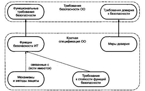 Рисунок 5 - Содержание раздела «Краткая спецификация ОО» Основное назначение раздела ЗБ «Краткая спецификация ОО» состоит в том, чтобы показать, как конкретным объектом оценки обеспечивается выполнение функций безопасности и мер доверия к безопасности для удовлетворения требований безопасности ИТ. Исходя из этого, должна быть сформирована краткая спецификация ОО, определяющая, каким образом ОО обеспечивает выполнение требований безопасности. В разделе ЗБ «Краткая спецификация ОО» целесообразно формулировать функции безопасности ИТ так, чтобы представить функциональные возможности безопасности ОО в более понятном для пользователя ЗБ виде по сравнению с ФТБ. В частности: a) функции безопасности ИТ могут быть изложены так, чтобы показать, что ОО предпринимает для обеспечения безопасности; b) функции безопасности ИТ могут быть специфицированы так, чтобы более точно отражать документацию ОО, например, путем использования специфической для ОО терминологии. Данное обстоятельство может повысить рентабельность оценки ОО, облегчая верификацию уровней представления ФБО (ЗБ, проектная документация). Один из возможных методов заключается в спецификации одной функции безопасности ИТ, удовлетворяющей нескольким ФТБ, если известно, что эти ФТБ выполняются теми же основными механизмами при проектировании и реализации (разработке) ОО. Данный подход выгоден для сокращения числа доказательств соответствия представления, которое должен обеспечить разработчик; c) специфическая для конкретного ОО терминология может быть учтена для того, чтобы описания, например, функций безопасности ИТ лучше соотносились с терминологией проекта руководства пользователя или администратора. Может потребоваться введение характерных терминов - таких как «субъект», «объект» или «роль администратора». Поэтому раздел «Краткая спецификация ОО» может быть охарактеризован как развитие требований, которым должен соответствовать конкретный ОО. При этом отсутствует необходимость в описании деталей реализации ОО, его архитектуры или принципов проектирования, или в подробном описании того, как, например, разработчик проводит функциональное тестирование безопасности ОО. 11.2 Спецификация функций безопасности информационных технологийКак проиллюстрировано в рисунке 5, раздел ЗБ «Краткая спецификация ОО» должен включать в себя спецификацию функций безопасности ОО. Задание по безопасности должно демонстрировать, что функции безопасности ИТ включают в себя все ФТБ, а также то, что каждая функция безопасности ИТ отображается, по крайней мере, на одном ФТБ. Функции безопасности ИТ, которые определяют основное назначение ОО с точки зрения обеспечения безопасности информации, должны быть рассмотрены более детально. При рассмотрении функций безопасности, соответствующих поддерживаемым ФТБ, функция безопасности ИТ могла бы быть изложена аналогично соответствующему ФТБ. Тем не менее, там, где необходимо, целесообразно пояснить функциональную возможность, например, используя специфическую для ОО терминологию. При необходимости, функции безопасности могут быть организованы иначе, чем соответствующие ФТБ, и иметь обозначение, отличное отданных ФТБ, что может быть направлено на то, чтобы упростить спецификацию функциональной возможности и облегчить со