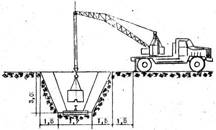 Перед началом работ по устройству колодца трубоукладчик (3) производит зачистку откосов и дна котлована, проверяет соответствие проекту отметки дна и крутизну откосов котлована.