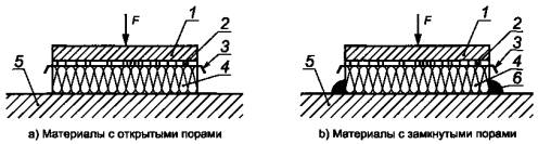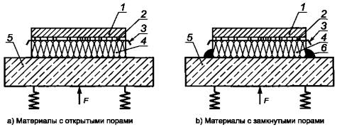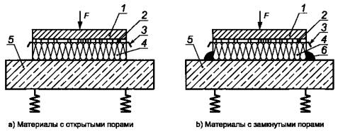 размерами сторон 200 Толщину образцов указывают в стандарте на конкретное изделие. Если в стандарте на конкретное изделие толщина образцов не установлена или отсутствует стандарт на конкретное изделие, толщина образцов должна быть согласована между заинтересованными сторонами. Поверхности образцов считают гладкими, если неровности поверхности менее Для сглаживания любых неровностей размером более Для образцов, изготовленных из материалов с замкнутыми порами, стык между образцом и основанием герметизируют по периметру вазелином [см. рисунки 1b)- 3b)]. 7 Методика проведения испытания7.1 Общие положения Резонансную частоту fr основной вертикальной составляющей вибрации системы с образцом определяют с применением следующих возбуждающих сигналов: синусоидальных, импульсных и «белого шума». Указанные методы являются эквивалентными. В случае разногласий применяют метод синусоидальных сигналов. 7.2 Синусоидальные сигналы Резонансную частоту системы определяют в процессе плавного изменения частоты синусоидального сигнала в диапазоне от 25 до 300 Гц, поддерживая при этом амплитуду возбуждающей силы постоянной. Если резонансная частота системы зависит от амплитуды возбуждающей силы, то эту зависимость прослеживают до самого низкого значения амплитуды, а резонансную частоту системы определяют методом экстраполяции до нулевого значения амплитуды возбуждающей силы. В зависимости от ожидаемого значения динамической жесткости интервалы возбуждающей силы F в случае экстраполирования должны быть: 0,2 Н ≤ F ≤ 0,8 Н, если s' > 50 МН/м3; 0,1 Н ≤ F ≤ 0,4 Н, если s' ≤ 50 МН/м3. В пределах указанных интервалов проводят измерения не менее чем при трех значениях возбуждающей силы. 1 - нагружающая пластина; 2 - паста из строительного гипса; 3 - пленка; 4 - образец; 5 - основание; 6 - вазелин Рисунок 1 - Возбуждение нагружающей пластины. Измерение вибрации нагружающей пластины 1 - нагружающая пластина; 2 - паста из строительного гипса; 3 - пленка; 4 - образец; 5 - основание; 6 - вазелин Рисунок 2 - Возбуждение нагружающей пластины. Измерение вибрации нагружающей пластины и основания 1 - нагружающая пластина; 2 - паста из строительного гипса; 3 - пленка; 4 - образец; 5 - основание; 6 - вазелин Рисунок 3 - Возбуждение нагружающей пластины. Измерение вибрации нагружающей пластины и основания 7.3 «Белый шум» или импульсные сигналы При применении в качестве возбуждающих сигналов «белого шума» или импульсных сигналов резонансную частоту определяют на основе частотной характеристики в соответствии с требованиями ГОСТ ИСО 7626-2 или созданием ударного возбуждения - ГОСТ ИСО 7626-5. 8 Обработка результатов8.1 Полная динамическая жесткость s't, отнесенная к площади поверхности образца Полную динамическую жесткость системы s't, Н/м3, отнесенную к площади поверхности образца, определяют по формуле