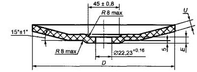 4.7 Допуск параллельности и перпендикулярности торцов кругов (кроме типов 28, 29) не должен превышать 4.8 Классы неуравновешенности кругов по ГОСТ 3060, не более: - для кругов с предельной рабочей скоростью свыше 63 м/с; - для кругов с предельной рабочей скоростью до 63 м/с. 4.9 Круги (кроме типа 29) изготовляют твердостями от M до Z по ГОСТ Р 52587 и звуковыми индексами от 31 до 41 по ГОСТ Р 52710. 4.10 Внешний вид кругов (кроме типа 29) - по ГОСТ Р 52781. 4.11 Допускается изготовлять круги типа 5 с максимальным радиусом закругления внутренних торцовой и боковой поверхностей выточки, равным 4.12 Требования надежности Надежность кругов (кроме типа 29) определена коэффициентом шлифования (отношение объема снятого металла к объему изношенной части круга); кругов типа 29 - режущей способностью (отношение объема снятого материала к времени обработки). 4.13 Маркировка 4.13.1 Маркировка кругов - в соответствии с требованиями ГОСТ Р 52588. Примечания 1. Не маркируют тип круга, буквы F, Р в обозначении зернистости. 2. Допускается вместо марки абразивного материала маркировать вид абразивного материала для кругов типа 29. 4.13.2 Место нанесения маркировки Маркировку наносят: -