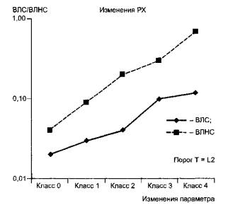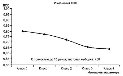Рисунок 2 - Кривая ХСС Устойчивость системы идентификации по отношению к факторам воздействия может быть определена по изменениям ХСС, полученной при испытаниях на робастность. Изменения ХСС показывают, как при появлении факторов воздействия изменяется ВСС. Изменения ХСС могут быть проиллюстрированы в виде графика, изображенного на рисунке 3, на котором классы соответствуют изменениям параметров в рамках факторов воздействия, при этом изменения параметров указывают на оси X, а ВСС - на оси Y.