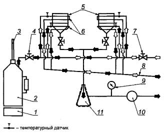 1 - нагревательное устройство; 2 - парогенератор; 3 - вентиляционный канал; 4 - пар; 5 - фильтрующие элементы (см. рисунок 1); 6 - нагревающие/охлаждающие змеевики; 7 - подача холодной воды для охлаждения; 8 - дренажная линия; 9 - вакуумметр; 10 - вакуумный насос; 11 - вакуумная колба во взрывобезопасном исполнении Рисунок 2 - Схематическое изображение фильтровальной установки 6.12 Высокоскоростная мешалка любого типа минимальной скоростью 400 об/мин. 6.13 Эксикатор с осушителем, герметично закрытый. 6.14 Охлаждающий сосуд типа эксикатора или другого герметично закрытого сосуда, применяемый для охлаждения фильтров перед взвешиванием. Осушитель не должен использоваться. 6.15 Градуированный шприц или промывалка минимальной вместимостью 25 см3 с ценой деления 0,5 см3. 6.16 Пинцет с концами в виде лопаточек. 6.17 Весы с одной или двумя чашками чувствительностью 0,1 мг для взвешивания фильтров. Вторые весы с более низкой чувствительностью 10 мг можно использовать для взвешивания образца. 7 Подготовка образцовТщательно перемешивают весь образец в течение 30 с, используя по возможности высокоскоростную мешалку (6.12). Образец, взятый стеклянной или политетрафторэтиленовой палочкой для перемешивания (6.4), опущенной до дна контейнера, должен быть однородным. При использовании топлива с высоким содержанием парафина (высокая температура потери текучести) или с очень высокой вязкостью образец перед перемешиванием нагревают. Температура нагрева образца должна быть на 15 °С - 18 °С выше температуры потери текучести для топлив с низкой вязкостью или достаточной, чтобы получить вязкость в диапазоне от 150 до 250 мм2/с для топлив с высокой вязкостью. Температура не должна превышать 80 °С на стадии подготовки образцов. 8 Подготовка фильтровДля каждого испытания сушат два стекловолоконных фильтра (6.11)