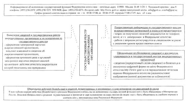 Зарегистрировано в Минюсте РФ 16 декабря 2009 г. Регистрационный № 15621 Административный регламент Содержание I. Общие положения1. Настоящий административный регламент устанавливает порядок исполнения Федеральным агентством по техническому регулированию и метрологии (далее - Федеральное агентство) государственной функции по ведению государственного реестра (далее - государственный реестр) аккредитованных организаций, осуществляющих деятельность по оценке соответствия продукции, производственных процессов и услуг установленным требованиям качества и безопасности, а также деятельность по обеспечению единства измерений (далее - государственная функция). 2. Государственную функцию исполняет непосредственно Федеральное агентство по техническому регулированию и метрологии. 3. Перечень нормативных правовых актов, непосредственно регулирующих исполнение государственной функции: Федеральный закон от 27 декабря 2002 г. № 184-ФЗ "О техническом регулировании" (Собрание законодательства Российской Федерации, 2002, № 52, ст. 5140; 2005, № 19, ст. 1752; 2007, № 19, ст. 2293; 2007, № 49, ст. 6070; 2008, № 30 (часть II), ст. 3616; 2009, № 29, ст. 3626); Федеральный закон от 26 июня 2008 г. № 102-ФЗ "Об обеспечении единства измерений" (Собрание законодательства Российской Федерации, 2008, № 26, ст. 3021); постановление Правительства Российской Федерации от 17 июня 2004 г. № 294 "О Федеральном агентстве по техническому регулированию и метрологии" (Собрание законодательства Российской Федерации, 2004, № 25, ст. 2575; 2004, № 44, ст. 4357; 2006, № 37, ст. 3881; 2008, № 24, ст. 2868; 2008, № 46, ст. 5337; 2009, № 6, ст. 738; 2009, № 25, ст. 3065; 2009, № 33, ст. 4088); постановление Правительства Российской Федерации от 24 февраля 2009 г. № 163 "Об аккредитации органов по сертификации и испытательных лабораторий (центров), выполняющих работы по подтверждению соответствия" (Собрание законодательства Российской Федерации, 2009, № 10, ст. 1221); постановление Госстандарта России от 30 декабря 1999 г. № 72 "Об утверждении общих правил по проведению аккредитации в Российской Федерации" (зарегистрирован в Минюсте России 7 февраля 2000 г., рег. № 2094, опубликован в Бюллетене нормативных актов федеральных органов исполнительной власти, 2000, № 9). 4. Результаты исполнения государственной функции: включение в государственный реестр предусмотренных пунктом 33 настоящего Административного регламента сведений об аккредитованных органах по сертификации, испытательных лабораториях (центрах), осуществляющих деятельность в области оценки соответствия, метрологических службах, аккредитованных на право поверки средств измерений, аттестации методик (методов) измерений, относящихся к сфере государственного регулирования обеспечения единства измерений, выполнения испытаний стандартных образцов или средств измерений в целях утверждения типа, обязательной метрологической экспертизы стандартов, продукции, проектной, конструкторской, технологической документации и других объектов, проводимой в случаях, предусмотренных законодательством Российской Федерации (далее - аккредитованные организации); предоставление запрашиваемых сведений из государственного реестра и опубликование сведений об аккредитованных организациях, предусмотренных пунктом 60 настоящего Административного регламента, в информационной системе общего пользования и периодическом печатном издании Федерального аге