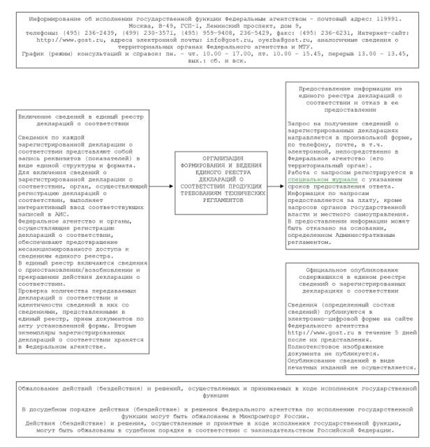 Зарегистрировано в Минюсте РФ 16 декабря 2009 г. Регистрационный № 15608 Административный регламент Содержание I. Общие положения1. Настоящий административный регламент устанавливает порядок исполнения Федеральным агентством по техническому регулированию и метрологии (далее - Федеральное агентство) государственной функции по организации формирования и ведения единого реестра деклараций о соответствии (далее - государственная функция). 2. Государственную функцию исполняет Федеральное агентство, а также его территориальные органы - межрегиональные территориальные управления (далее - МТУ) в части предоставления сведений о декларациях о соответствии, содержащихся в едином реестре деклараций о соответствии (далее - единый реестр). 3. Перечень нормативных правовых актов, непосредственно регулирующих исполнение государственной функции: Федеральный закон от 27 декабря 2002 г. № 184-ФЗ "О техническом регулировании" (Собрание законодательства Российской Федерации, 2002, № 52, ст. 5140; 2005, № 19, ст. 1752; 2007, № 19, ст. 2293; 2007, № 49, ст. 6070; 2008, № 30 (часть II), ст. 3616; 2009, № 29, ст. 3626); постановление Правительства Российской Федерации от 17 июня 2004 г. № 294 "О Федеральном агентстве по техническому регулированию и метрологии" (Собрание законодательства Российской Федерации, 2004, № 25, ст. 2575; 2004, № 44, ст. 4357; 2006, № 37, ст. 3881; 2008, № 24, ст. 2868; 2008, № 46, ст. 5337; 2009, № 6, ст. 738; 2009, № 25, ст. 3065; 2009, № 33, ст. 4088); постановление Правительства Российской Федерации от 25 декабря 2008 г. № 1028 "Об утверждении Положения о формировании и ведении единого реестра деклараций о соответствии, регистрации деклараций о соответствии, предоставлении содержащихся в указанном реестре сведений и об оплате за предоставление таких сведений" (Собрание законодательства Российской Федерации, 2009, № 2, ст. 228); приказ Министерства промышленности и энергетики Российской Федерации от 22 марта 2006 г. № 54 "Об утверждении формы декларации о соответствии продукции требованиям технических регламентов" (зарегистрирован в Минюсте России 15 мая 2006 г. № 7826, опубликован в Бюллетене нормативных актов федеральных органов исполнительной власти, 2006, № 21; 2007, № 49); приказ Министерства промышленности и торговли Российской Федерации от 19 марта 2009 г. № 151 "Об утверждении формы заявления о регистрации и формы уведомления о прекращении действия декларации о соответствии продукции требованиям технических регламентов" (зарегистрирован в Минюсте России 16 апреля 2009 г. № 13788, опубликован в Бюллетене нормативных актов федеральных органов исполнительной власти, 2009, № 19); приказ Министерства промышленности и торговли Российской Федерации от 12 августа 2009 г. № 741 "Об утверждении формы уведомления о приостановлении или прекращении действия декларации о соответствии продукции требованиям технических регламентов органом государственного контроля (надзора)" (зарегистрирован в Минюсте России 1 октября 2009 г. № 14926, опубликован в Бюллетене нормативных актов федеральных органов исполнительной власти, 2009, № 41). 4. Результаты исполнения государственной функции: включение в единый реестр сведений о декларациях о соответствии продукции требованиям технических регламентов (далее - декларация о соответствии), зарегистрированных органами по сертификации, осуществляющими регистрацию деклараций о соответствии (далее - орган по сертификации), о приостановле