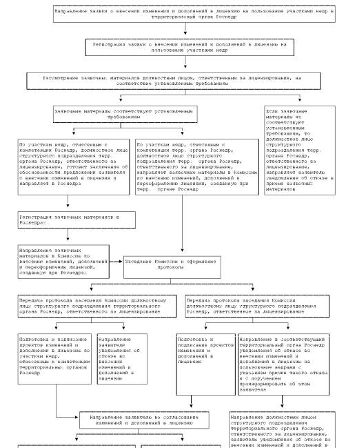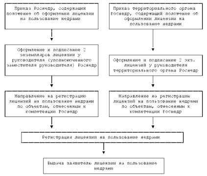 Зарегистрировано в Минюсте РФ 25 декабря 2009 г. Регистрационный № 15837 Административный регламент Содержание I. Общие положения1. Настоящий Административный регламент определяет последовательность и сроки действий (административных процедур) по исполнению государственных функций по осуществлению выдачи, оформления и регистрации лицензий на пользование недрами, внесения изменений и дополнений в лицензии на пользование участками недр, а также переоформления лицензий, и принятия, в том числе по представлению Федеральной службы по надзору в сфере природопользования и иных уполномоченных органов, решений о досрочном прекращении, приостановлении и ограничении права пользования участками недр. 2. Исполнение государственных функций по осуществлению выдачи, оформления и регистрации лицензий на пользование недрами, внесения изменений и дополнений в лицензии на пользование участками недр, а также переоформления лицензий, и принятия, в том числе по представлению Федеральной службы по надзору в сфере природопользования и иных уполномоченных органов, решений о досрочном прекращении, приостановлении и ограничении права пользования участками недр, (далее - государственные функции) осуществляется в соответствии с: Законом Российской Федерации от 21 февраля 1992 г. № 2395-I "О недрах" (Ведомости Съезда народных депутатов Российской Федерации и Верховного Совета Российской Федерации, 1992, № 16, ст. 834; Собрание законодательства Российской Федерации, 1995, № 10, ст. 823; 1999, № 7, ст. 879; 2000, № 2, ст. 141; 2001, № 21, ст. 2061; 2001, № 33, ст. 3429; 2002, № 22, ст. 2026; 2003, № 23, ст. 2174; 2004, № 27, ст. 2711; 2004, № 35, ст. 3607; 2006, № 17 (1 ч.), ст. 1778; 2006, № 44, ст. 4538; 2007, № 27, ст. 3213; 2007, № 49, ст. 6056; 2008, № 18, ст. 1941; № 29, ст. 3418, ст. 3420; № 30, (2 ч.), ст. 3616; 2009, № 1, ст. 17; № 29, ст. 3601); Федеральным законом от 30 декабря 1995 г. № 225-ФЗ "О соглашениях о разделе продукции" (Собрание законодательства Российской Федерации, 1996, № 1, ст. 18; 1999, № 2, ст. 246; 2001, № 26, ст. 2579; 2003, № 23, ст. 2174; 2004, № 27, ст. 2711; 2005, № 1 (1 ч.), ст. 25; 2009, № 1, ст. 17); Федеральным законом от 30 ноября 1995 г. № 187-ФЗ "О континентальном шельфе Российской Федерации" (Собрание законодательства Российской Федерации, 1995, № 49, ст. 4694; 1999, № 7, ст. 879; 2001, № 33, ст. 3429; 2003, № 17, ст. 1557; 2003, № 27, ст. 2700; 2003, № 46, ст. 4444; 2004, № 35, ст. 3607; 2005, № 19, ст. 1752; 2006, № 45, ст. 4640; 2007, № 50, ст. 6246; 2008, № 18, ст. 1941; 2008, № 29 (ч. 1), ст. 3420; 2008, № 49, ст. 5748); Федеральным законом от 31 июля 1998 г. № 155-ФЗ "О внутренних морских водах, территориальном море и прилежащей зоне Российской Федерации" (Собрание законодательства Российской Федерации, 1998, № 31, ст. 3833; 2003, № 17, ст. 1556; 2003, № 27 (1 ч.), ст. 2700; 2003, № 46 (1 ч.), ст. 4444; 2004, № 35, ст. 3607; 2007, № 46, ст. 5557; 2008, № 30 (ч. 2), ст. 3616; 08.12.2008, № 49, ст. 5748); Федеральным законом от 26 октября 2002 г. № 127-ФЗ "О несостоятельности (банкротстве)" (Собрание законодательства Российской Федерации, 2002, № 43, ст. 4190; 2004, № 35, ст. 3607; 2005, № 1 (часть 1), ст. 18; 2005, № 1 (часть 1), ст. 46; 2005, № 44, ст. 4471; 2006, № 30, ст. 3292; 2006, № 52 (1 ч.), ст. 5497; 2007, № 7, ст. 834; 2007, № 18, ст. 2117; 2007, № 30, ст. 3753; 2007, № 30, ст. 3754; 2007, № 41, ст. 4845; 2007, № 48 (2 ч.), ст. 5814; 2007, № 49, ст. 6078; 2007, № 49, ст. 6079; 2008, № 30 (ч. 2), ст. 3616; 2008, № 49, ст. 5748; 2009, № 1, ст. 4; 2009, № 1, ст. 14; 2009, № 18 (1 ч.), ст. 2153; 2009, № 29, ст. 3632); Федеральным законом от 2 мая 2006 г. № 59-ФЗ "О порядке рассмотрения обращений граждан Российской Федерации" (Собрание законодательства Российской Федерации, 2006, № 19, ст. 2060); постановлением Верховного Совета Российской Федерации от 15 и