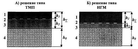 Рисунок 1. Типы принципиальных конструктивных решений: 1 - верхний слой покрытия толщиной h1; 2 - армирующая прослойка; 3 - нижний слой покрытия толщиной h2 из новой или регенерированной смеси; 4 - существующее покрытие или несущее основание При уточнении местоположения армирующей прослойки следует учесть, что при выборе решения типа ТМП назначают h1 £ h2, а при выборе решения НГР - h1 > h2. Учитывая, что на покрытие одновременно воздействуют нагрузки от транспортных средств и температурные напряжения, наилучшие результаты достигаются при одновременном применении решений типа ТМП и НГР. аVII) Укладка армирующей прослойки непосредственно на существующее асфальтобетонное и, тем более, цементобетонное покрытие менее эффективна, нежели на свежеуложенный или регенерированный слой асфальтобетона. Это объясняется необходимостью обеспечения прочного сцепления арматуры с армируемым материалом для обеспечения перераспределения возникающих напряжений. Поэтому при выборе решения НГР нижний слой покрытия (выравнивающий слой) может устраиваться из мелкозернистого асфальтобетона или регенерированного материала существующего покрытия. аVIII) Минимальная толщина слоев асфальтобетонного покрытия должна соответствовать рекомендациям документов (СНиП 2.05.02-85*, ОДН 218.046-01, Методические рекомендации по проектированию жестких дорожных одежд) и таблицам 4, 5 и 6. Минимальные толщины слоев