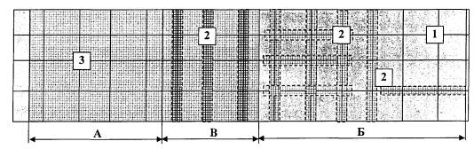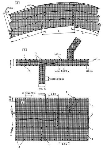 Рисунок 2 Схемы укладки геосетки (геокомпозита): А - сплошная; Б - участковая; В -