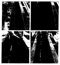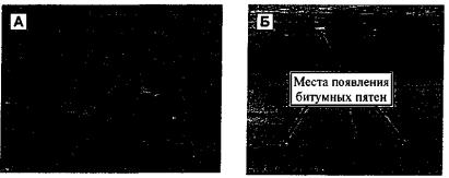 Рисунок 3 Битумные пятна на поверхности покрытия вIV) В случае применения армированного асфальтобетона при уширении существующей дорожной одежды до норм соответствующих категорий ремонтируемого участка автомобильной дороги, или при восстановлении дорожной одежды в местах ремонта земляного полотна спектр работ по подготовке основания начинается с сооружения или ремонта земляного полотна и завершается очисткой и подгрунтовкой поверхности нового несущего основания. вV) В простейшем случае подготовка основания включает очистку его от пыли и грязи, устранение выбоин и других мелких дефектов, очистку и заделку герметизирующим материалом трещин с шириной раскрытия более 5 мм. При несоответствии ровности основания выполняют выравнивание его поверхности путем фрезерования или устройства выравнивающего слоя. г) Организация комплекса работ по подготовке основания должна обеспечить требуемый темп работ по устройству армированного покрытия. Поэтому в зависимости от видов и объемов подготовительных работ они могут выполняться отдельным специализированным отрядом (бригадой) с организационным разрывом между устройством покрытия. При этом длина сменных захваток на подготовке основания и устройстве покрытия может быть разной, в зависимости от темпа выполнения ведущих операций (эксплуатационной производительности ведущих машин). При сравнительно небольших объемах подготовительных работ (п. вV настоящего раздела) они ведутся параллельно со строительством армированного покрытия. д) Устройство армированного асфальтобетонного покрытия производят только после приемки основания (существующего покрытия) представителями технического надзора органа управления с оформлением соответствующих документов. Приемка основания ведется согласно СНиП 3.06.03-85. е) Все виды работ по устройству армированного покрытия должны выполняться на одной сменной захватке, длина которой определяется эксплуатационной производительностью и количеством ведущих машин. Обычно в качестве ведущей машины выступает асфальтоукладчик, реже - катки, автосамосвалы. Сменный темп работ может определять и производительность АБЗ. ж) Первым видом работ, выполняемых на захватке, является очистка основания. Основание следует тщательно очистить от пыли с помощью поливомоечной или подметально-уборочной машины. При наличии бортового камня особое внимание при очистке следует уделить лотку проезжей части в зоне стыка основания с камнем. Эту зону целесообразно очищать подметально-уборочной машиной с пылесосом или вручную. з) Сразу после очистки основания выполняют розлив вяжущего (подгрунтовка), выбор которого, расход и порядок розлива производят в зависимости от условий производства работ, вида применяемого геосинтетического материала, свойств нижнего слоя, на который укладывается армирующая прослойка. Подгрунтовка проводится в любом случае (даже если укладка нижнего и верхнего слоя асфальтобетонного покрытия ведется параллельно с разрывом в 1-2 смены). Эта операция должна выполняться очень тщательно, и необходима по двум причинам: - для обеспечения сцепления геосетки с нижним и верхним слоями покрытия, слоев между собой, для дальнейшей совместной работы; - из технологических соображений, для фиксации ("приклеивания") геосетки к нижнему слою на период движен