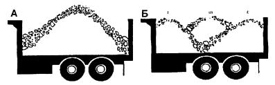 Рисунок 8 Варианты загрузки кузова: А - за один прием, приводящий к сильной сегрегации смеси; Б - рекомендуемый, в три приема. Для транспортировки асфальтобетонной смеси от асфальтобетонного завода к асфальтоукладчику следует использовать грузовые автомобили-самосвалы большой грузоподъемности имеющие: - конструкцию кузова, подогреваемого отходящими газами, и тентом для укрытия перевозимой смеси; - подъемное устройство, обеспечивающее постепенное увеличение угла наклона кузова с фиксацией его положения в нескольких местах; - высокую скорость движения и конструкцию подвески, которая создавала бы минимальную вибрацию при движении. Следует отметить, что выгрузка асфальтобетонной смеси напрямую из кузова автосамосвала большой грузоподъемности приводит к осадке асфальтоукладчика, в результате которой может уменьшаться толщина укладываемого слоя. По мере выработки смеси и снижения нагрузки на механизм толщина слоя может увеличиваться. Увеличение толщины слоя покрытия всего на 2-3 см требует увеличения контактного давления катка на 20-30 %, что трудно реализовать на практике. В конечном итоге нарушается ровность полосы укладки и, как следствие, снижается качество уплотнения и эффективность армирования покрытия. Величина температурной сегрегации смеси сразу после ее распределения укладчиком по площади покрытия может достигать 30-40 градусов. Столь существенная температурная неоднородность предопределяет значительную неоднородность прочности, деформативности и удобоуплотняемости смеси. Для обеспечения равномерного непрерывного поступления смеси к укладчику без прямого контакта с ним, устранения гранулометрической и температурной неоднородности смеси следует использовать конвейер - перегружатель. Использование этой машины в технологическом процессе значительно уменьшает вероятность пробуксовывания гусениц (колес) асфальтоукладчика, сдвига и повреждения армирующего материала. зVI) Общее время охлаждения различных слоев смеси от 160-140°С до 65-60°С при определенных погодных условиях составляет от 25 до 100 мин. В рамках этого времени необходимо выполнить весь объем работ по уплотнению. За период уплотнения прочность на сдвиг смеси возрастает примерно в 4 раза, а модуль деформации - в 15 раз. Поэтому подобрать рациональный состав звена можно только опытным путем, в процессе пробного уплотнения, ориентируясь на имеющиеся рекомендации. Окончательное решение о выборе режима уплотнения, не повреждающего геосетку, может быть принято в каждом конкретном случае только в процессе пробной укладки и уплотнения слоя. Для этого образцы в виде полос геосетки (не менее 5 образцов) должны быть извлечены (вырезаны) из покрытия, сразу после пробного уплотнения, до остывания слоя и переданы для испытания в лабораторию. В общем случае, в процессе уплотнения слоя катки должны двигаться по укатываемой полосе от ее краев к оси дороги, а затем от оси к краям, перекрывая каждый след на 20-30 см. При устройстве сопряженных полос вальцы катка при уплотнении первой полосы должны находиться от кромки сопряжения на расстоянии не менее 10 см. При уплотнении второй полосы первые проходы необходимо выполнять по продольному сопряжению с ранее уложенной полосой. При наезде на свежеуложенную полосу катки должны двигаться ведущими вальцами вперед, что искл