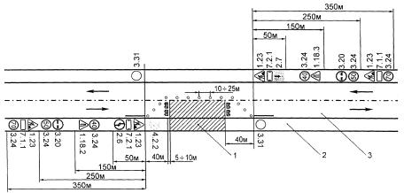Пример размещения технических средств организации дорожного движения и ограждения места производства работ показан на рисунке 9.